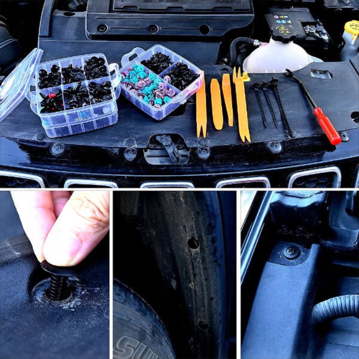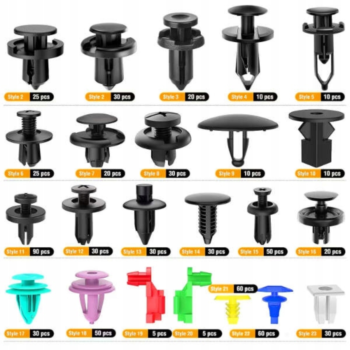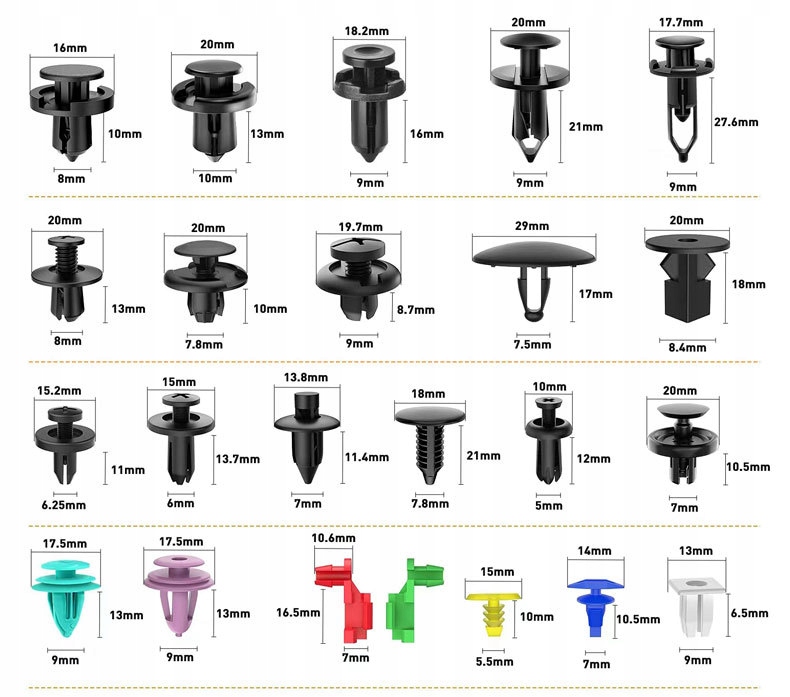 Універсальний кріпильний комплект, ідеально підходить для ремонту та заміни кліпів, дюбелів та оббивних мангалів, колісних дуг, бамперів та багатьох інших міжнародних та зовнішніх елементів автомобілів. Підходить до більшості брендів та моделей пасажирських автомобілів та фургонів з доставки. 4