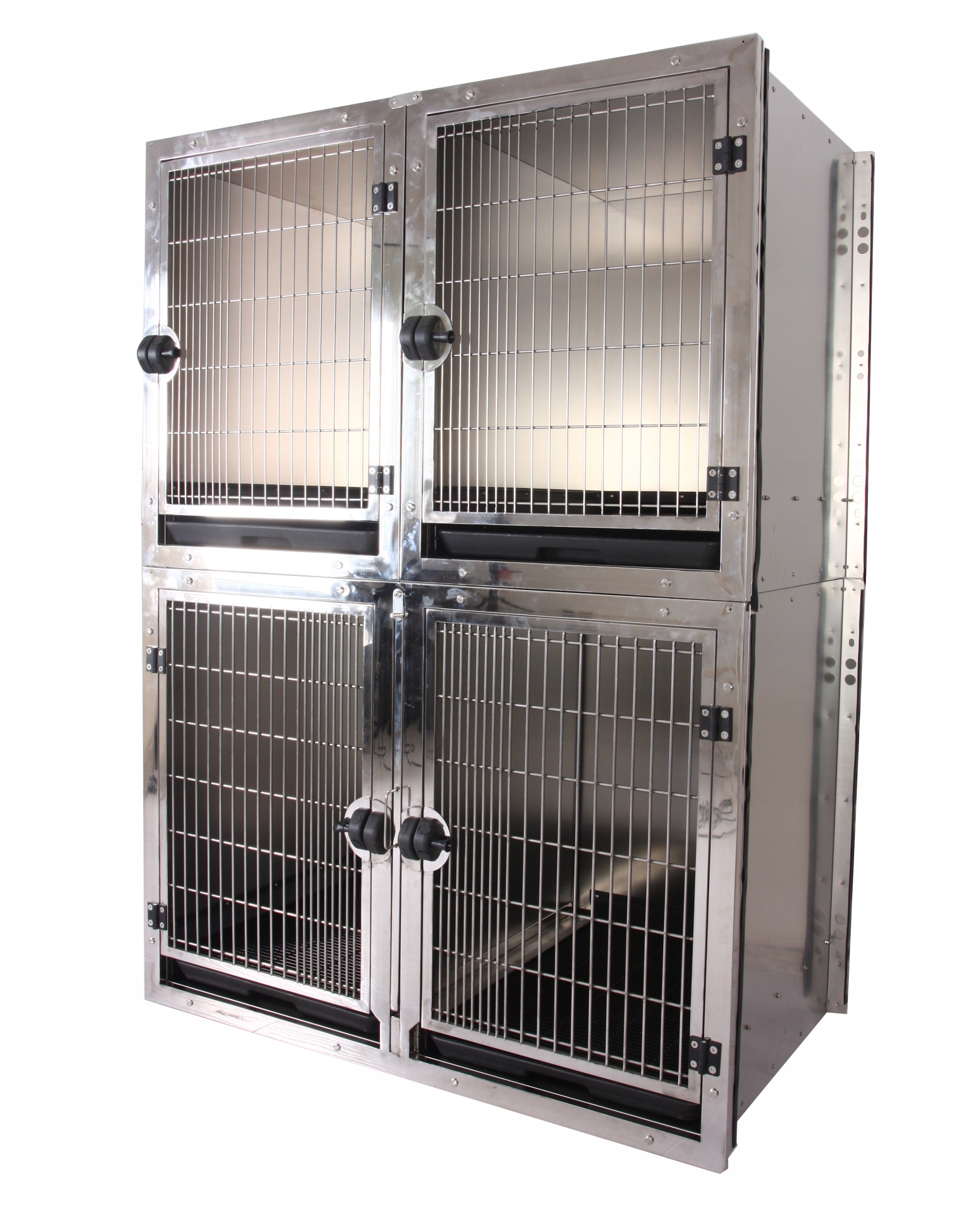 Набір кліток виготовлений з нержавіючої сталі. Клітки оснащені пластиковими висувними ящикамидля відходів і магнітною системою закриття, яка дозволяє швидко закривати клітку, запобігаючи її відкриттю собакою або іншою твариною, яка замкнена в клітці. Система закривання - магнітна. Крім того, клітка характеризується додатковим захистом у вигляді збільшеної кількості решіток при закриванніна вхідних дверях. Кожна клітка має дверцята із зварених прутків діаметром 3-4 мм. Відстань між прутами коливається від 3 см на петлях до 2 см під час закриття клітки.