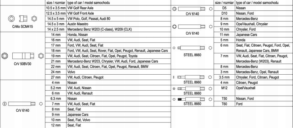 - Матеріал: CrMo SCM-415, CrV6140 , CrV50BV30, СТАЛЬ 8660
