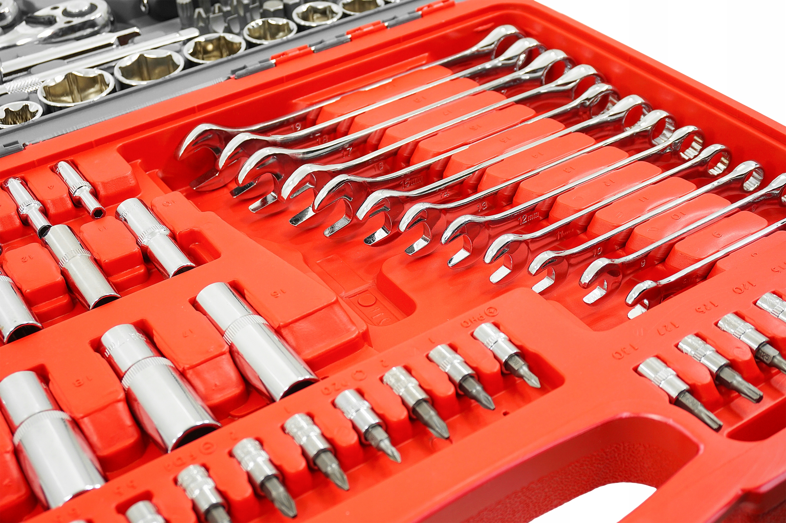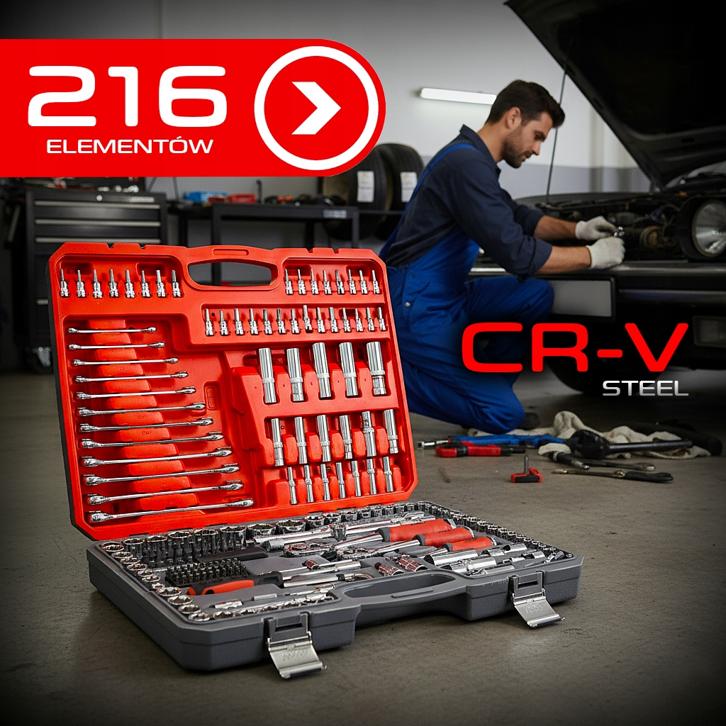 Професійний набір інструментів 216 предметів. Торцеві ключі та торцевий привід виготовлені з міцної хром-ванадієвої інструментальної сталі CR-V. Тріскачки мають 72 зуба. Інструменти виготовлені з використанням матеріалів найвищої якості, новітніх технологій і патентів. Завдяки поєднанню цих факторів ми отримуємо продукт професійної якості з величезною довговічністю. Набір дозволяє виконувати роботи, що вимагають дуже високих навантажень і точності, а також дозволяє виконувати багато сервісних робіт, пов'язаних з відкручуванням і закручуванням різьбових з'єднань різних номінальних розмірів.