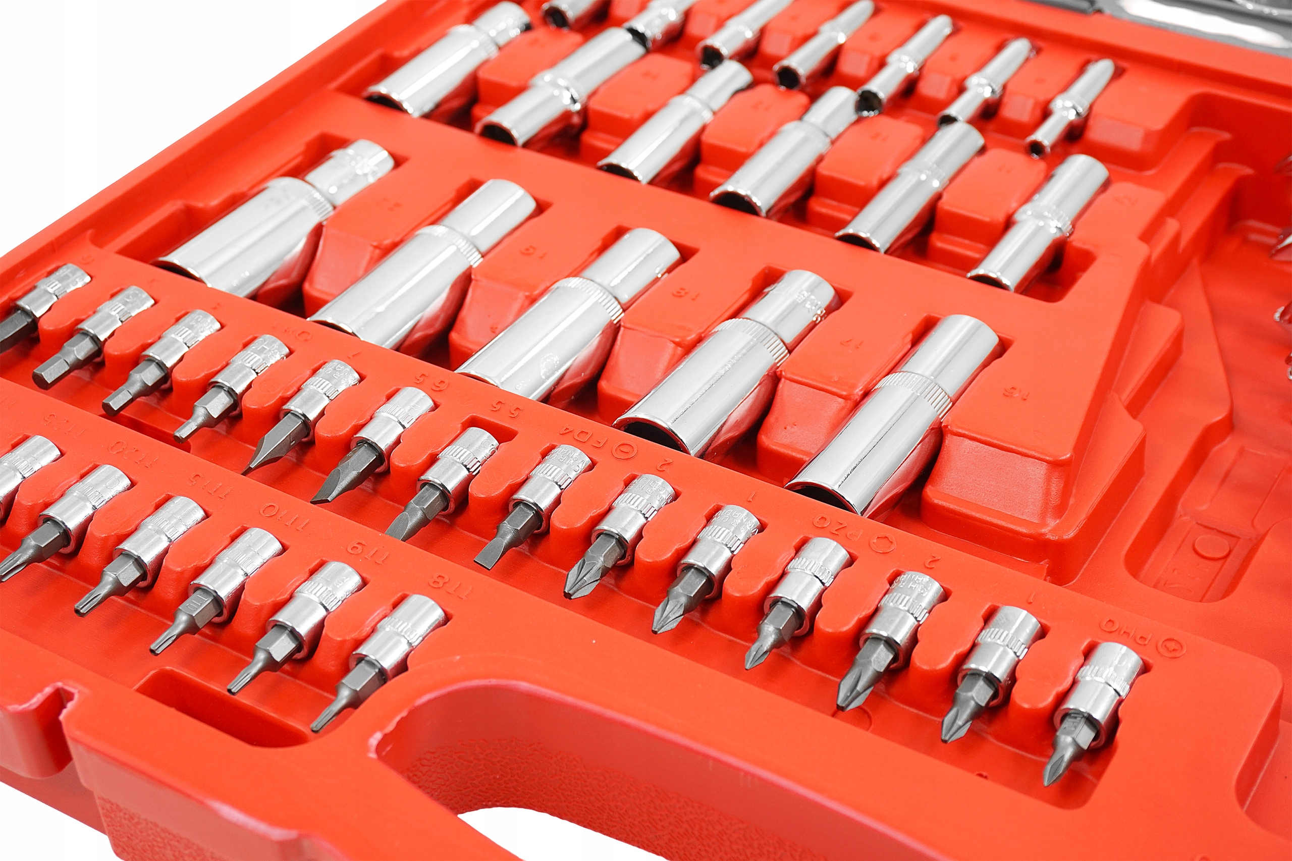Набір містить аж 216 ретельно відібраних елементів, що робить його повним пакетом інструментів, необхідних у майстерні, гаражі та під час монтажних робіт. Кожен тип головок, насадок і аксесуарів було підібрано для роботи з повним спектром різьбових з’єднань – від найменших прецизійних гвинтів до великих складальних елементів, які застосовуються в автомобільному та промисловому секторах.