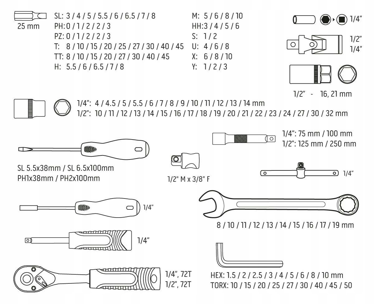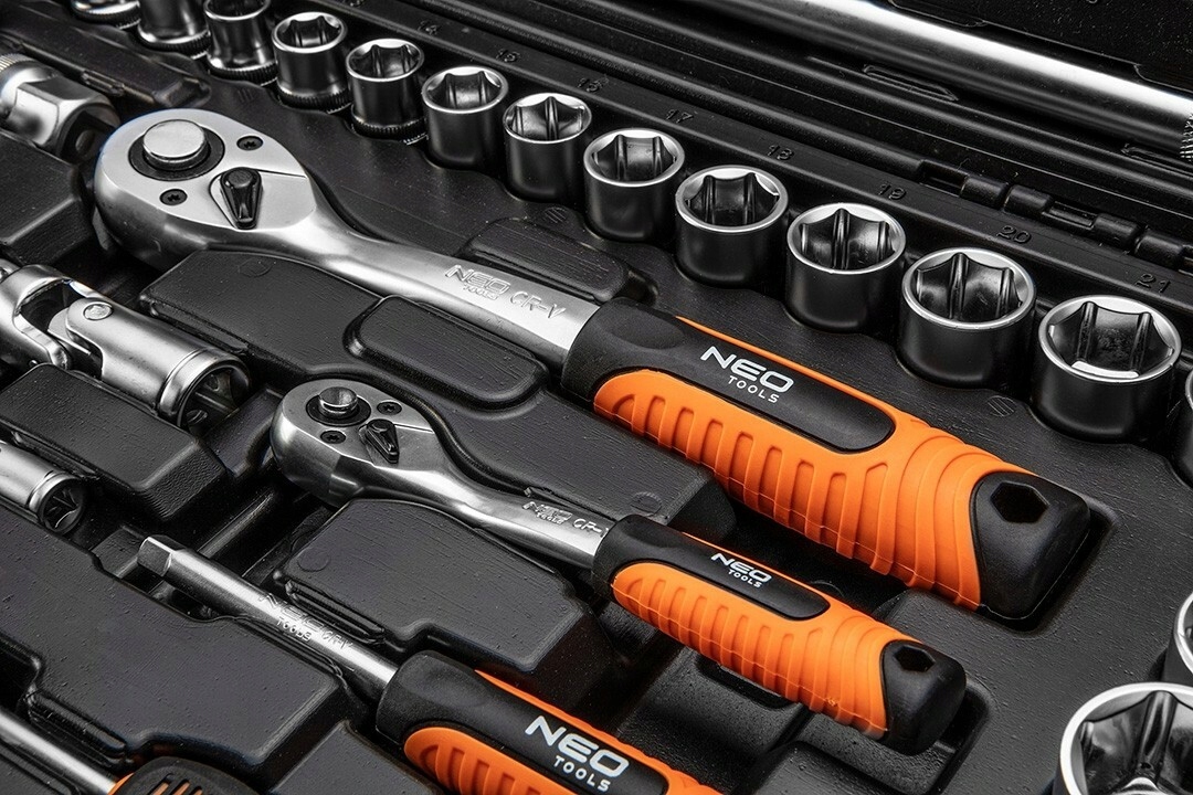 Набір торцевих ключів 10-208 від Neo Tools можна використовувати для ремонту транспортних засобів і механізмів. Елементи набору виготовлені зі сталі CrV і упаковані в практичну і міцну пластикову валізу. Храпові механізми на 72 зуба двох найпопулярніших розмірів 1/4" і 1/2", а також подовжувачі та з'єднання пропонують багато варіантів для регулювання гайкового ключа і діставання до важкодоступних місць. Крім того, в набір входять чотири викрутки, комбіновані ключі та два набори шестигранних ключів і ключів Torx, що збільшує можливість використання набору.