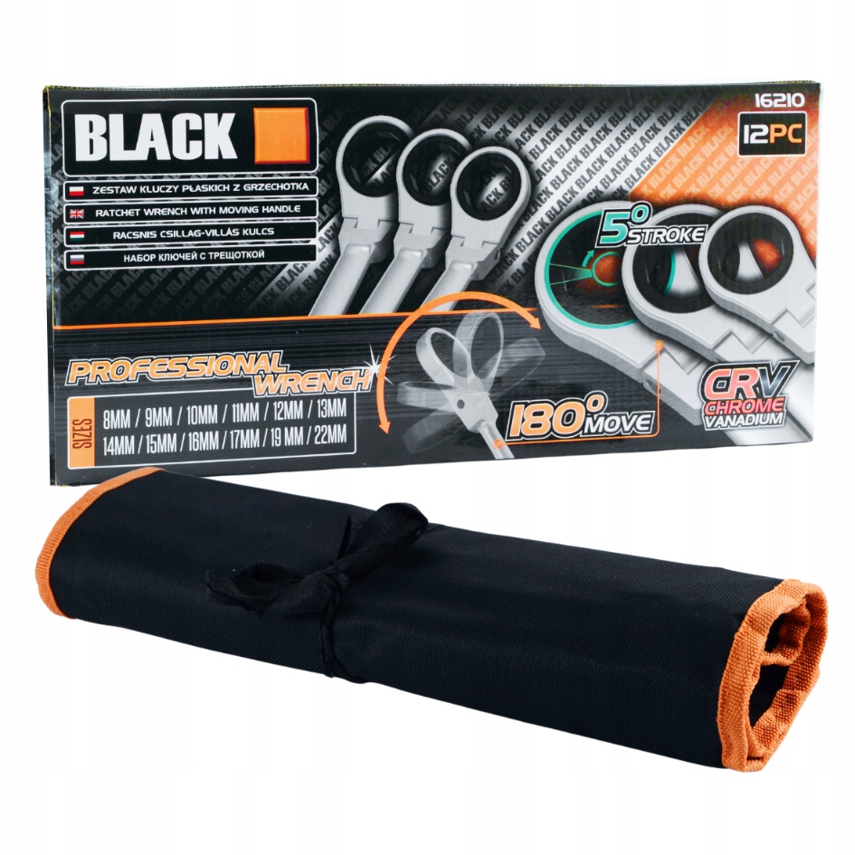 НАБІР КЛЮЧІВ ГАЙКОВИХ З ТРАЗЧАТКОВОЮ 8-22мм КОВАНИЙ ЛИСТ CrV BLACK