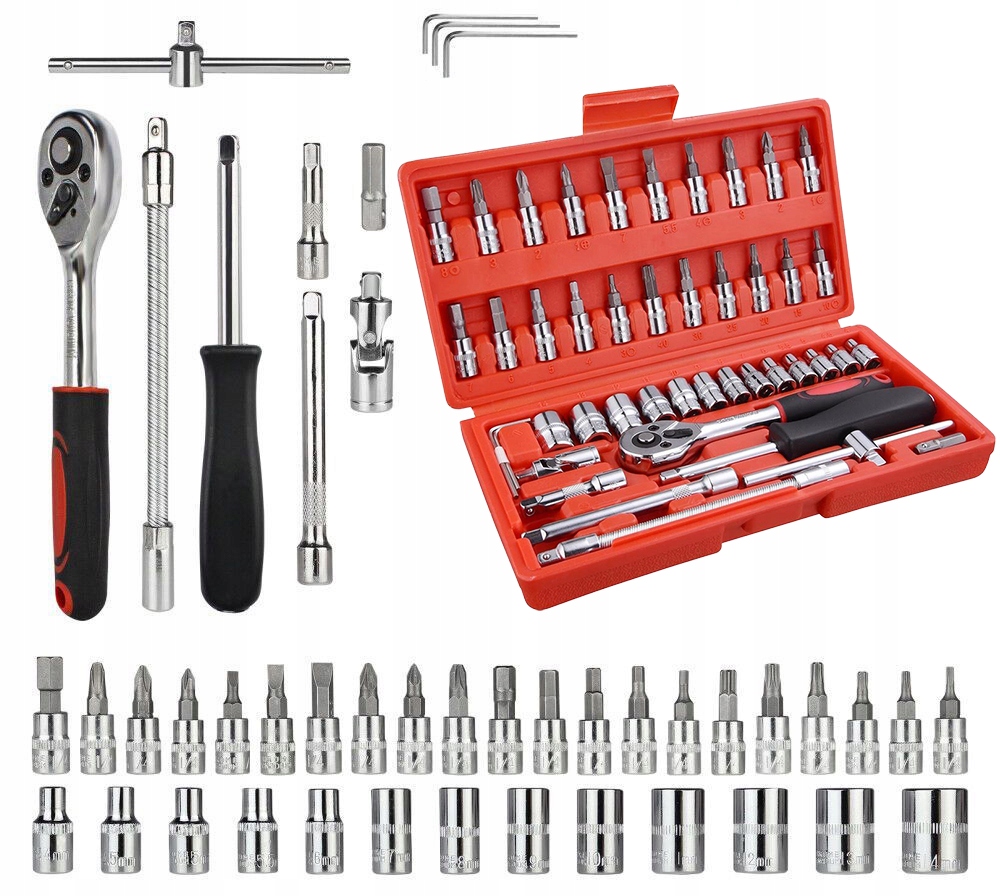 Набір оснащений багатьма головками, насадками для викрутки, подовжувачами (в тому числі гнучкими), 2 типами ручок - викруткою та поздовжньою, карданним шарніром, адаптером та тріскачкою з перемикач, що дозволяє швидко і легко змінювати напрямок обертання. Кожен з подовжувачів, ручок, тріскачки та карданного шарніра оснащений кулькою, яка запобігає випаданню прикріпленої розетки - це підвищує ефективність роботи та впливає на комфорт і безпеку, жодна розетка не випаде під час роботи.