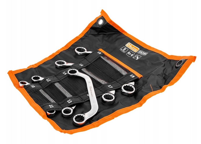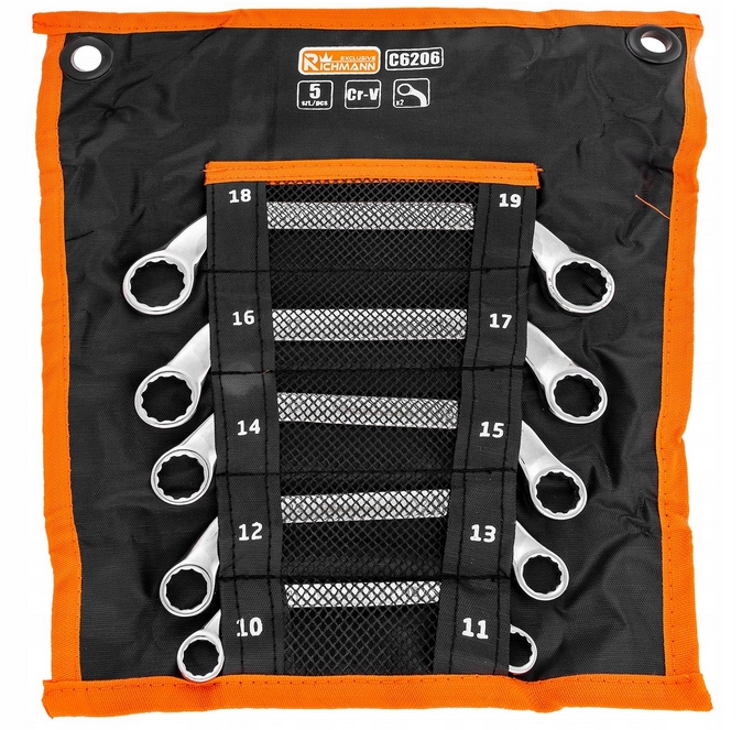 Набір з 5 штук "С" вук, двосторонніх, хром за розміром 10 - 19 мм. Вигнутий ключовий профіль дозволяє відкрутити гвинти у важкодоступних місцях, наприклад, коли генератори, що склалися, колекціонери, транспортування. Температура, внаслідок чого ванадієвий апарат також впливає на стійкість до деформаційних деформацій.