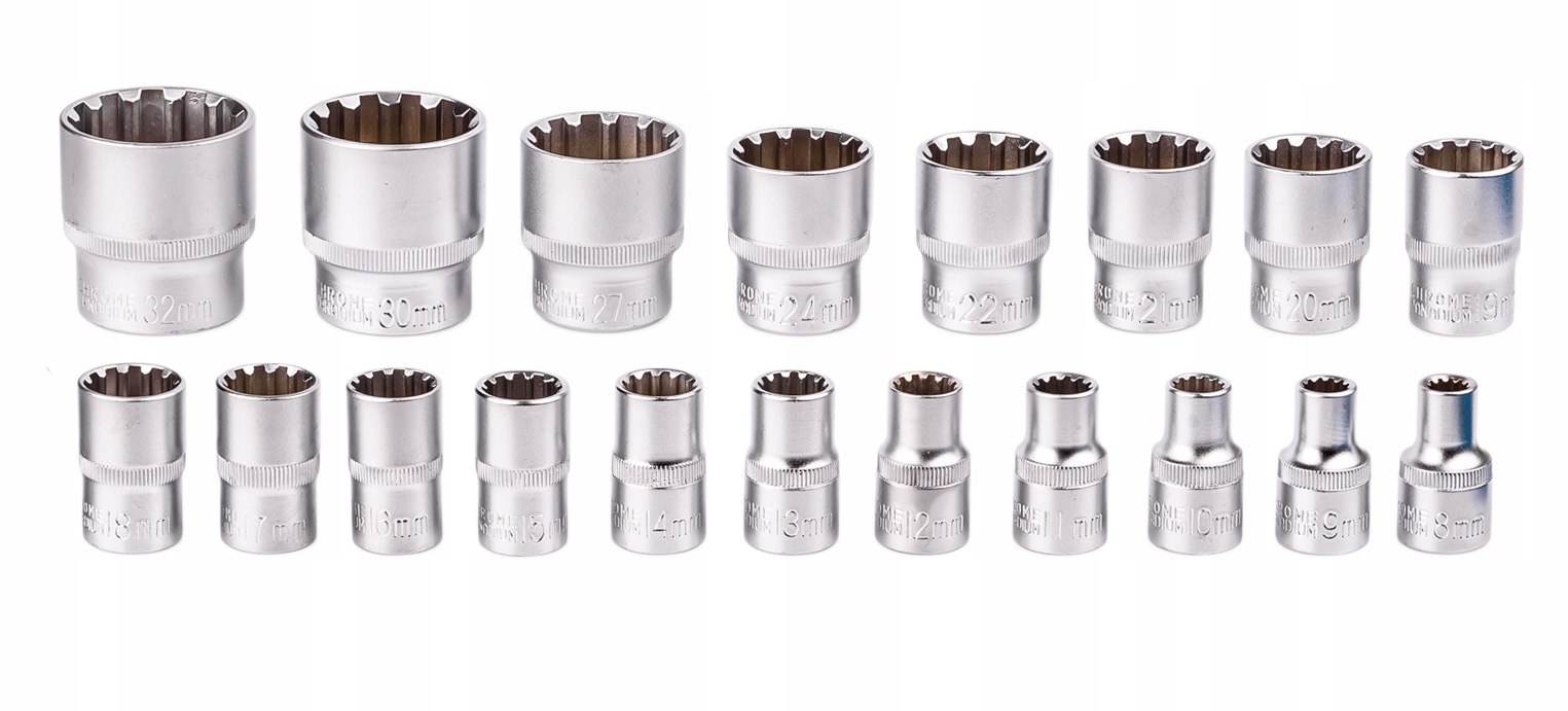 Набір включає 12-точкові розетки найпопулярніших розмірів від 8 мм b> до 32 мм. Вони виготовлені з високоякісної хром-ванадієвої (CrV) сталі.