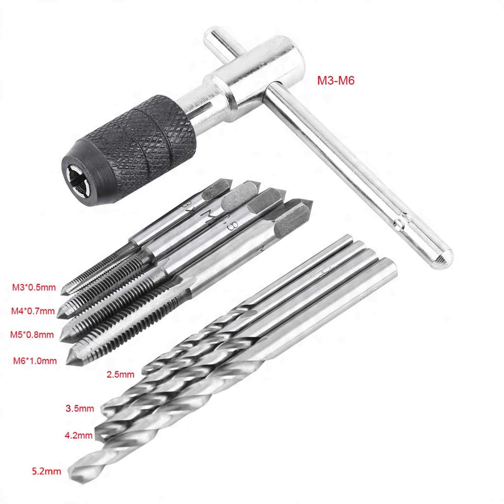 Цей набір клавіш та потоків є загальним інструментом для ручної різьби. Він містить 1 ключ до Т -урядових ниток, 4 нитки та 4 обмотки. Прийняття високоякісної підшипної сталі, яка довговічна для різання нитків. Завдяки цьому набору нитків та клавіш, обробка потоків стане простішою та точнішою.