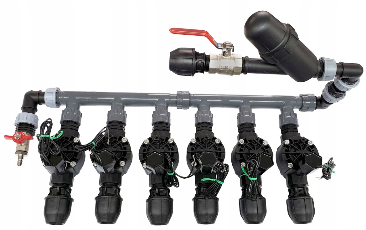 У комплект входить додатковий елемент між фільтром і колектором. Знявши його, можна вставити головний електромагнітний клапан, який захистить установку – він відкриється разом із кожним електромагнітним клапаном у кожній секції.