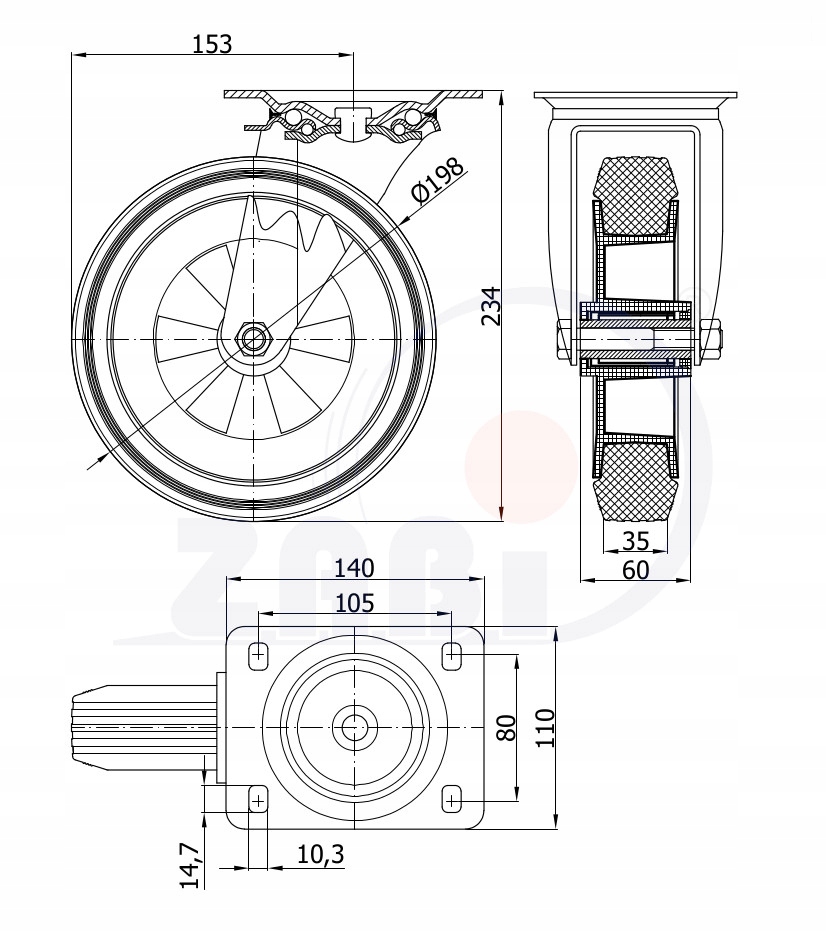- Пластиково-гумове колесо в поворотному корпусі складається з колеса з суцільногумовими шинами та пластиковими поліпропіленовими ободами та стійкого пресованого сталевого корпусу з пластинчасте кріплення та механічне гальмо.