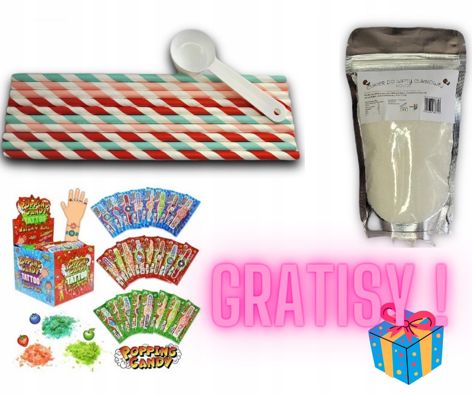 З набору 12+ 1 барвистий і ароматизований цукор Funkycolorви можете приготувати професійну солодку вату вдома. Кожен аромат упакований 100 г в герметично закриту тару з багаторазовою закупоркою. Щоб полегшити вашу пригоду з барвистою солодкою ватою, ми підготували набір безкоштовних подарунків, які додаються до кожної покупки: