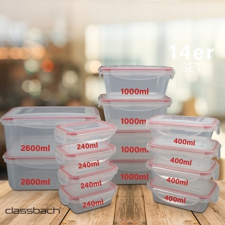 classbach c-fhd 4006 k -це набір, що складається з 14 прозорих контейнерів з герметичним закриттям різної здатності та розмірів . Вони створюються для зберігання їжі, як інгредієнтів, так і цілих страв. Контейнери - це також чудове рішення, якщо ви хочете взяти улюблену страву з собою. У них є герметичні закриття Click & Safe, завдяки тому, яка їжа не буде виливати або розливати , що може негативно вплинути на пряме середовище контейнера або свіжість збережених страв. -40 до +110 ° C . Таким чином, ми можемо зберігати їх у морозилці, а також нагрівати посуд в них за допомогою мікрохвильової піч . Матеріал безпечний для здоров’я та позбавлений шкідливих речовин (без BPA)