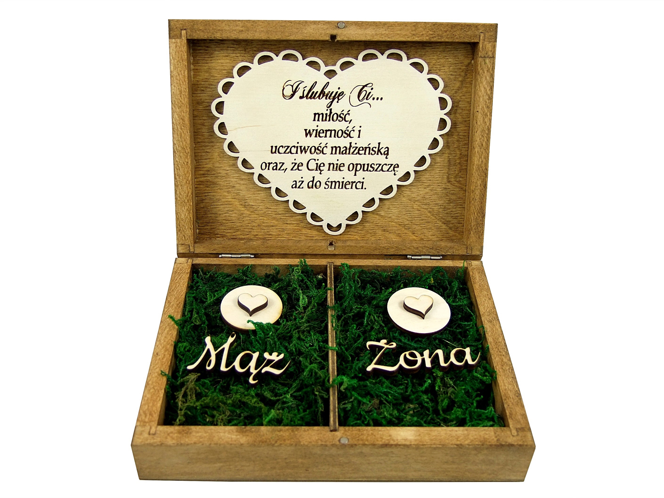 Наповнювач — красивий зелений мох із вирізаними словами «Дружина та чоловік»і двома сердечками для обручок