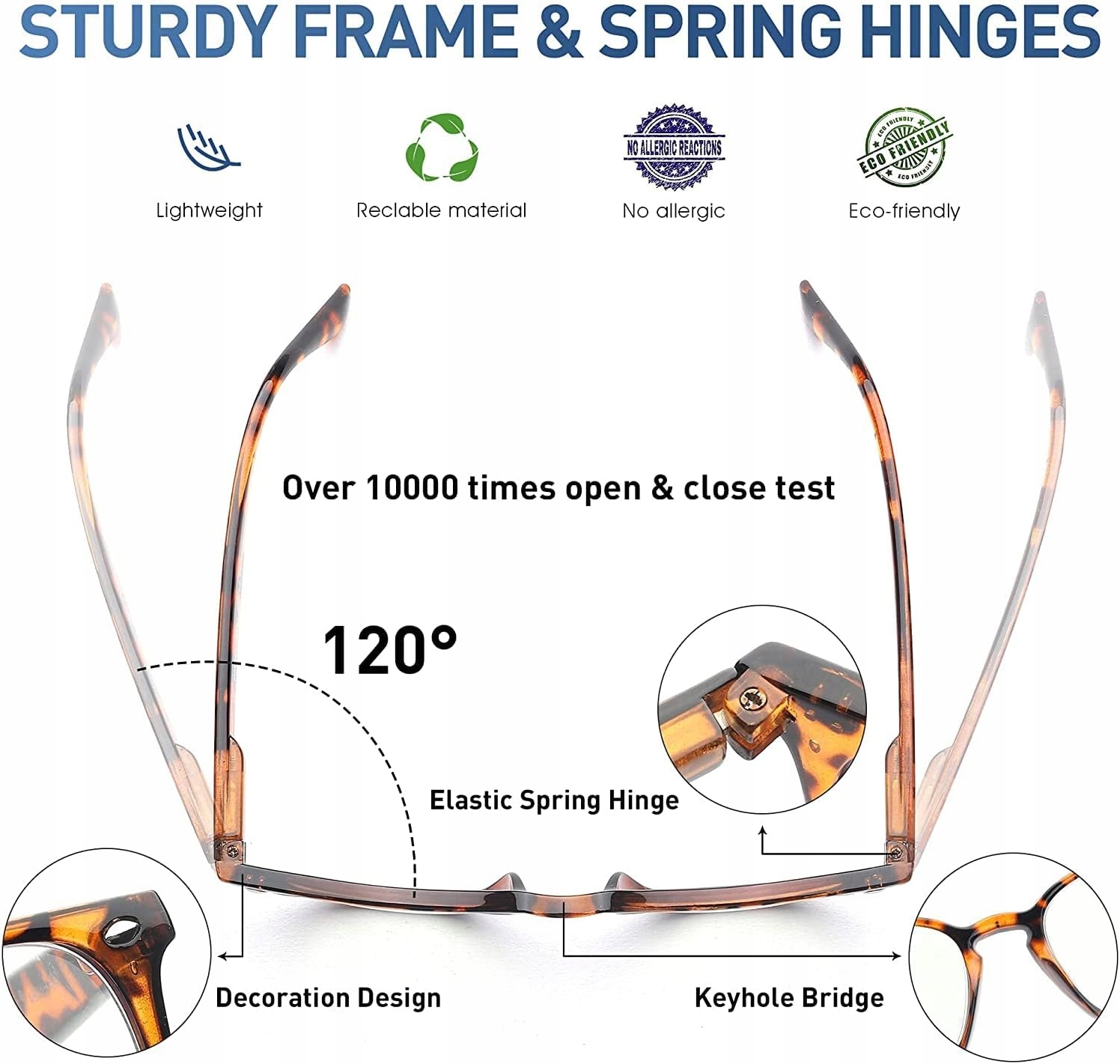 - Підвищена міцність: Для забезпечення більш тривалості окулярів для читання ми використовуємо полікарбонатний матеріал, завдяки якому вони є міцними очима та запобігають синьому світлу
