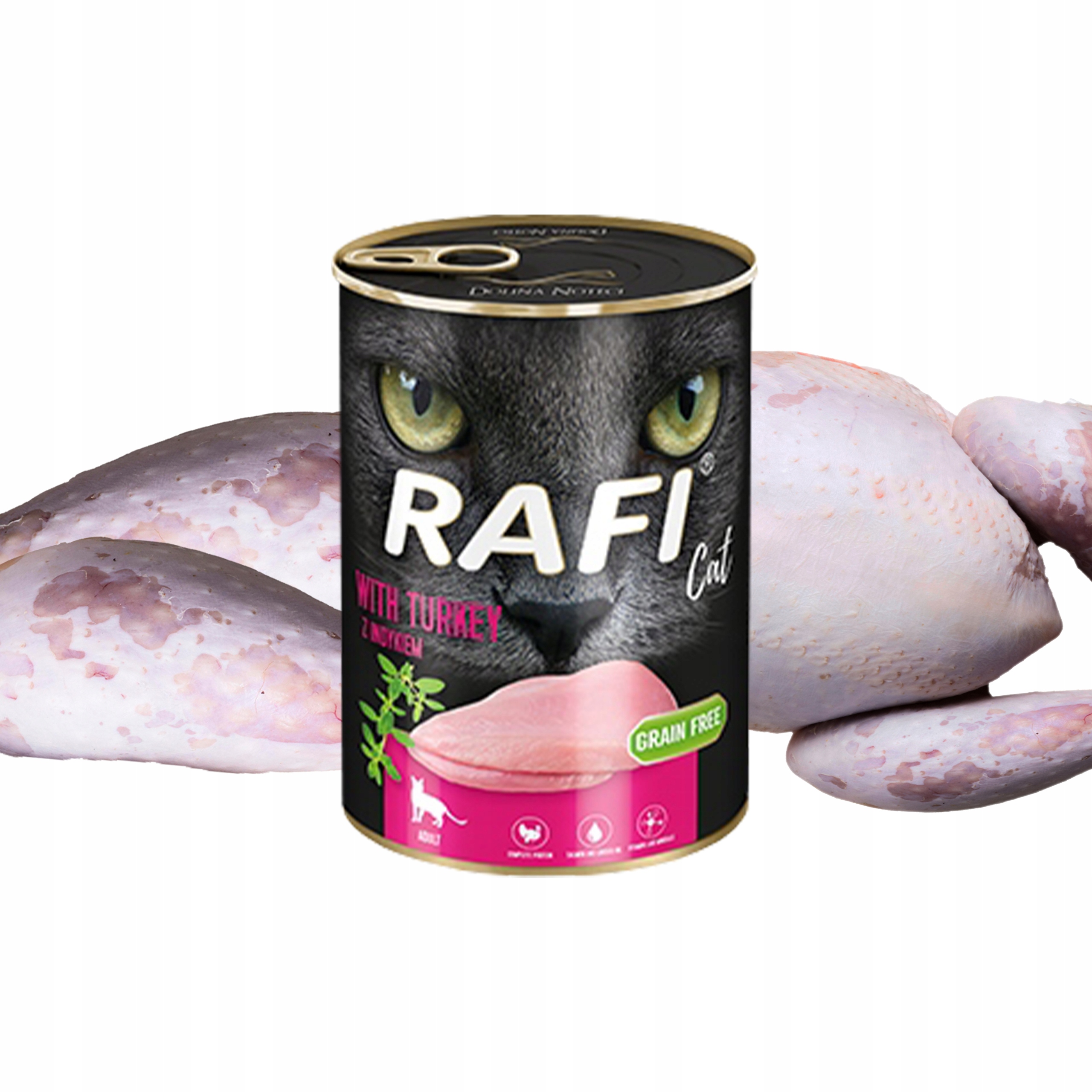 м'ясо та продукти тваринного походження 65% (м'ясо індички 4%), олії та жири (лляна олія 0,6%, лососева олія 0,5%), мінеральні речовини, сушений чебрець 0,01%. p>