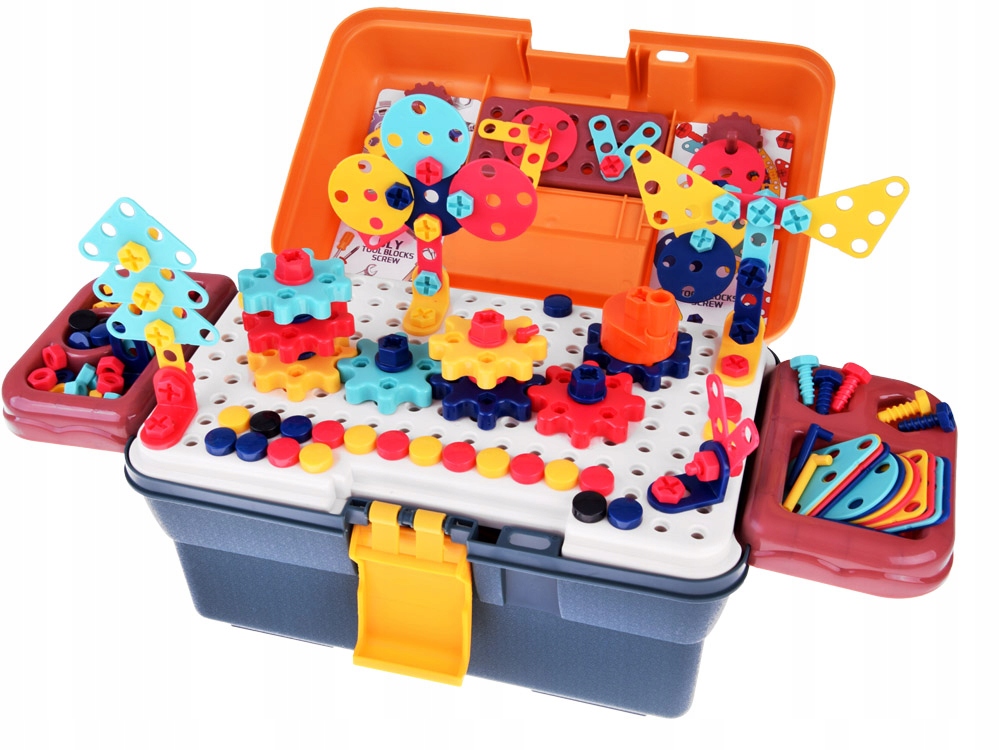 Багатий оснащений набір для молодого самого самого себе - це коробка передач з інструментами, гвинтами, гвинтами та аксесуарами. Гра в скрученні, ремонті, створенні нових 3D -будівель дасть молодому майству багато творчих розваг.