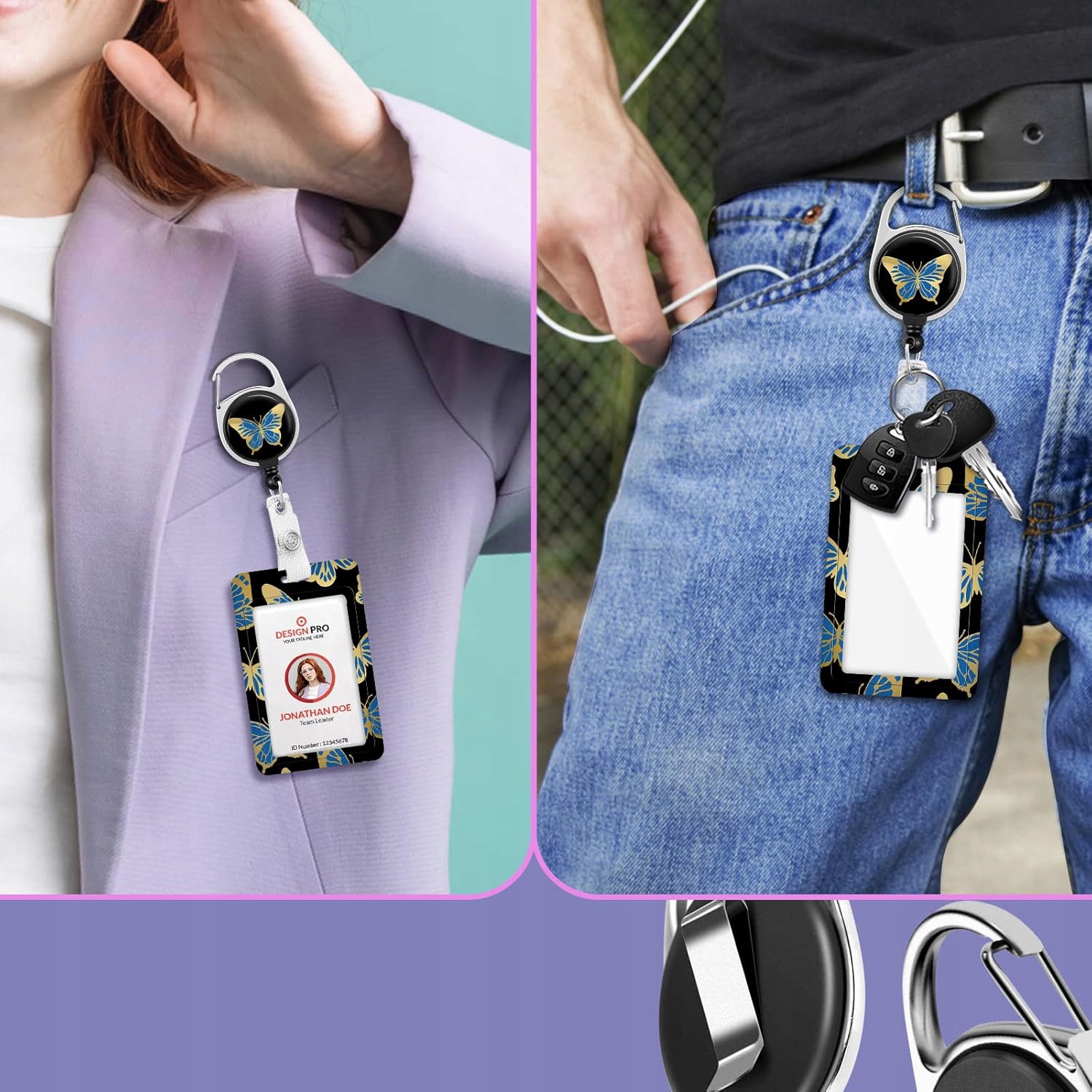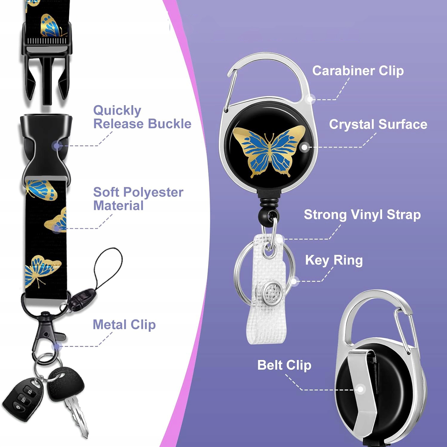 58 см, прихований, чарівний та смішний барабан для ідентифікатора, зручний для сканування та поза офісом. Металеві карабіни та затискач для ременів дозволяють стабільне кріплення до смужок, кишень та рюкзаків. Максимальне навантаження 127 г або 8 ключів. Дуже міцний і еластичний.
