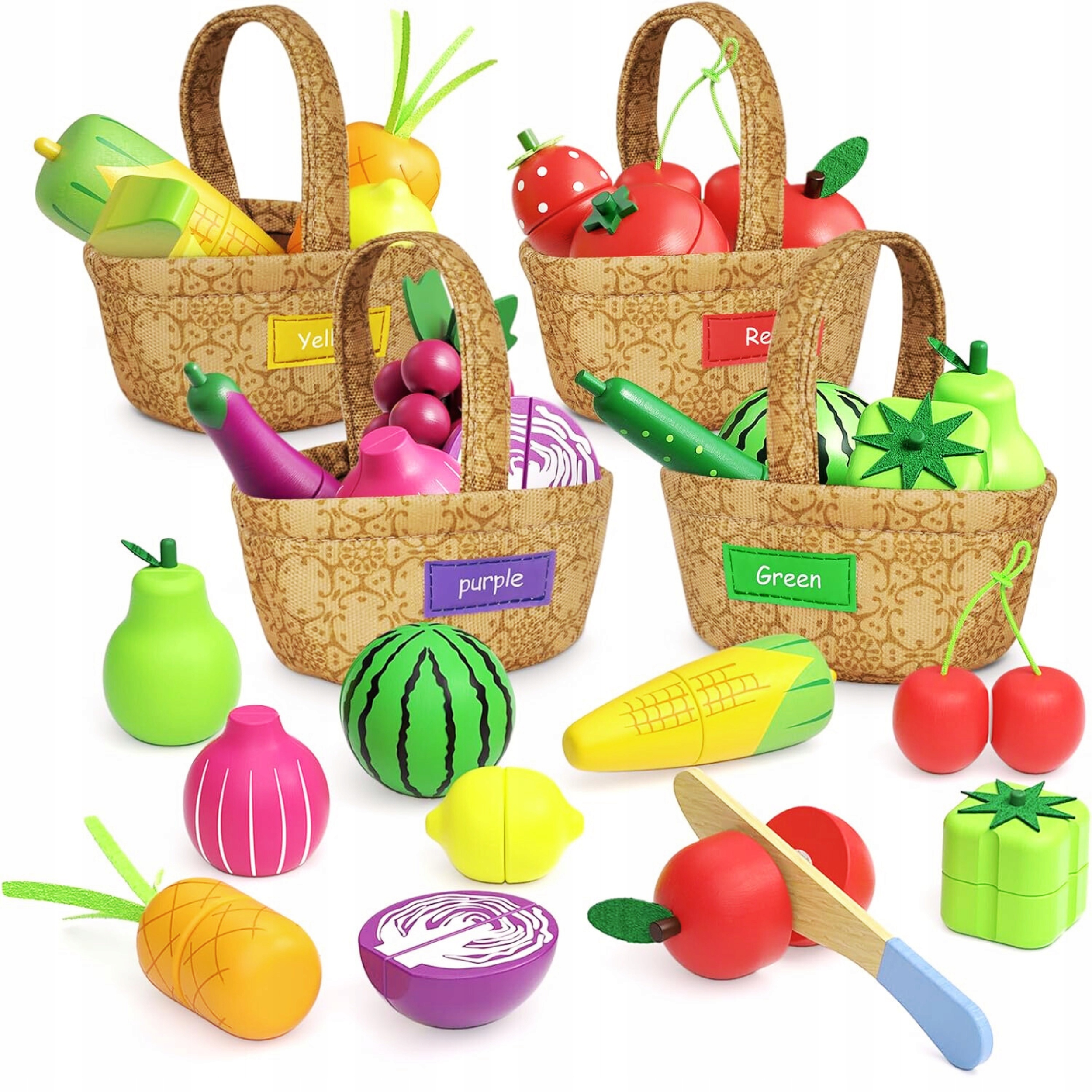➡️ Кількість елементів: 22 шт. (16 фруктів/овочів + 2 ножі + 4 кошики)