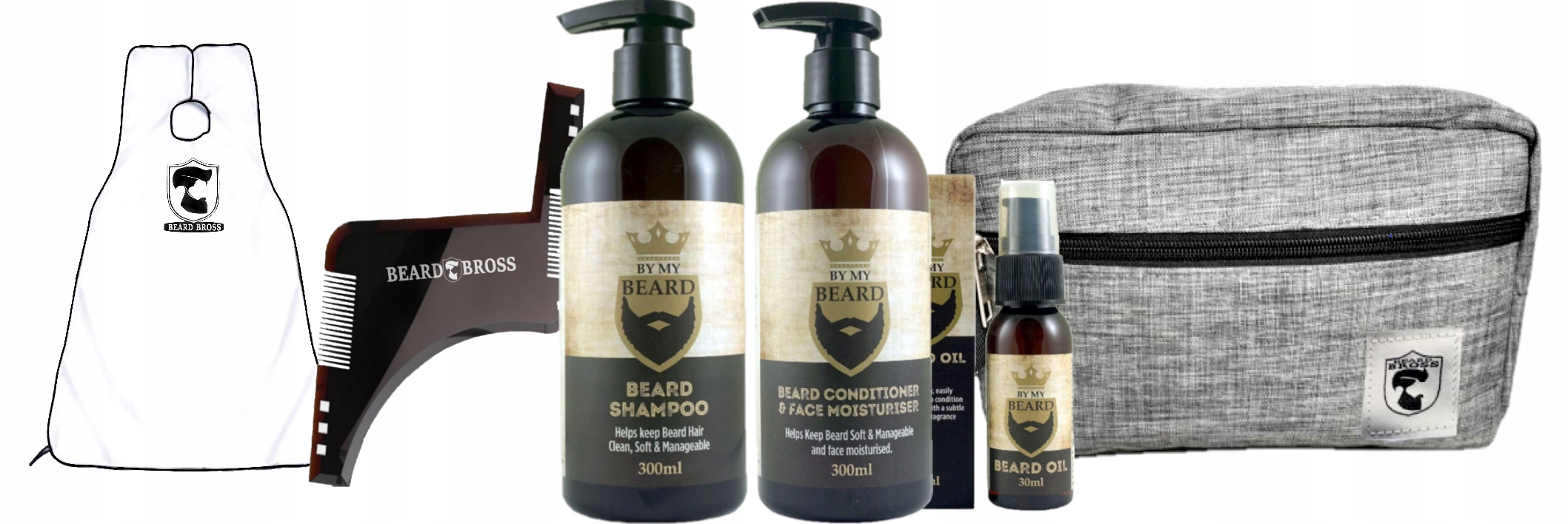 У вартість входить набір косметики для догляду за бородою та волоссям з шампунем, бальзамом і олією від By My Beard і косметичка Beard Bross - перукарська накидка і шаблон для коригування лінії бороди.