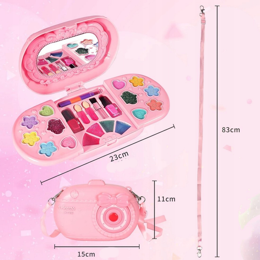 Чарівний багажник, наповнений косметикою іграшок, є ідеальною альтернативою подарунку для всіх маленьких принцес, які часто збирають косметику своїм матерям, щоб грати в комфорті професійного косметолога. Косметика розміщується у великому рожевому багажнику у світло -рожевому кольорі, кріпленому засувкою. Після його відкриття ефект дивовижний.