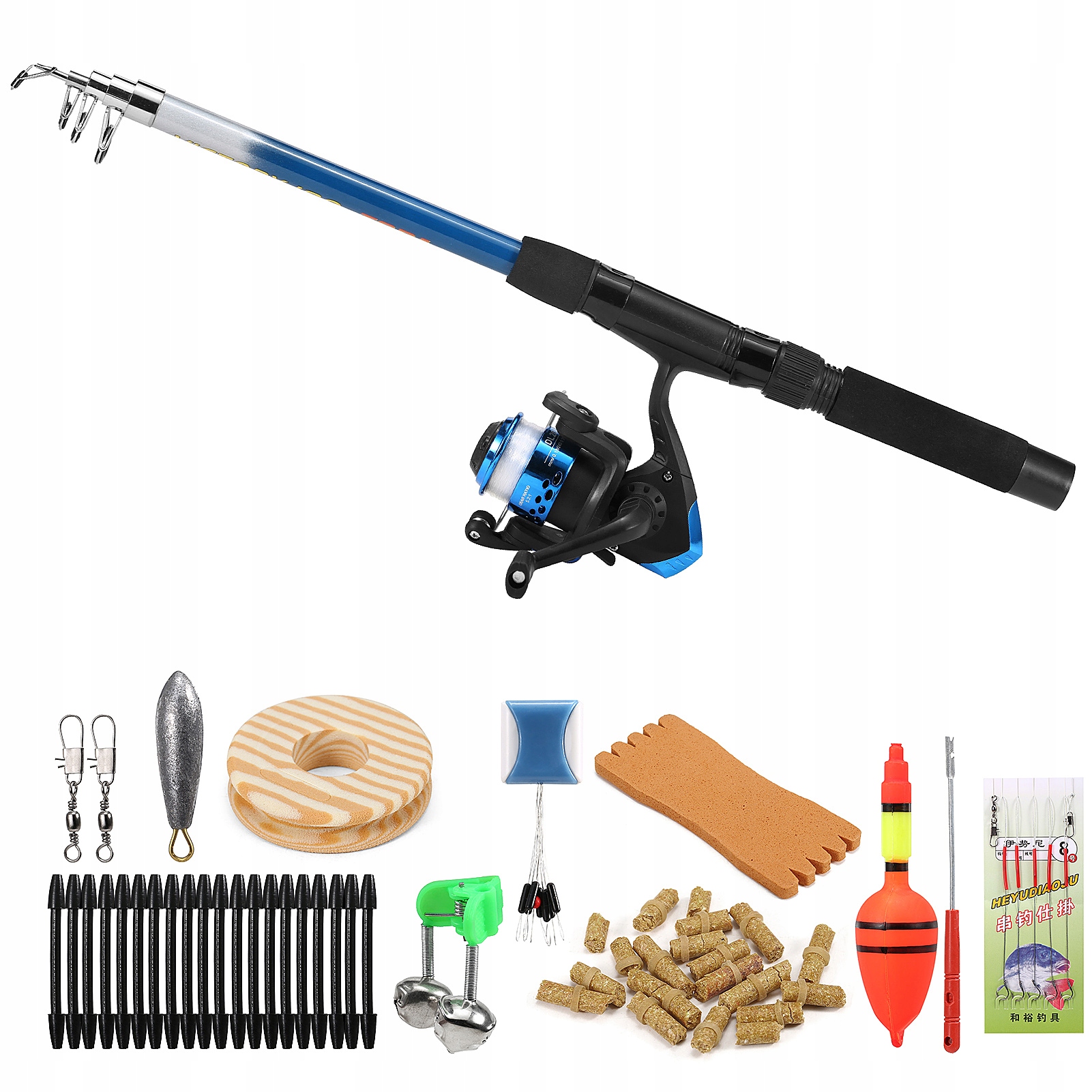 Включає різні аксесуари для риболовлі: волосяні поводки, вертлюги, приманки, дзвіночок, поплавок, грузило, пристрій для зняття гачка, дошку для волосіні, котушку для волосіні та багато іншого.