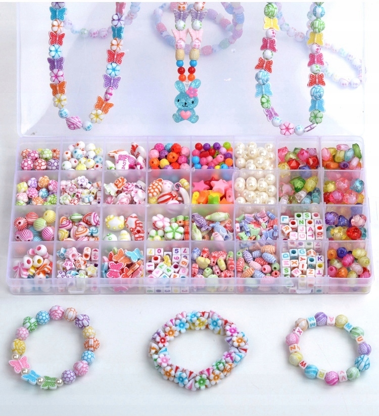 Відкрийте світ кольорів, візерунків та необмеженої уяви разом з нашим набором бісеру! Цей творчий набір - це багато намистин у різних формах - букв, обличчя, серця та квіти - які дозволяють дітям (і не тільки!) Створювати ювелірні вироби, пристосовані до власного стилю. Все упаковано в практичний організатор, готовий до негайної розваги.