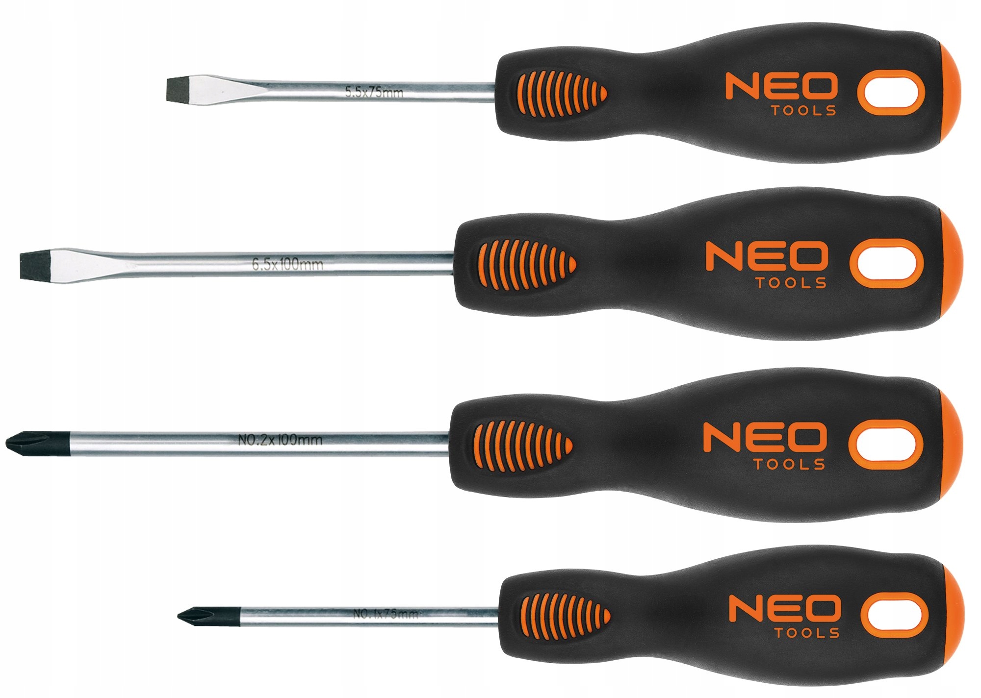 Набір викруток NEO включає 4 викрутки: плоску та хрестову. Наконечник викрутки виготовлений з надзвичайно міцної хромомолібденової сталі. Робочий наконечник наконечника пройшов термічну обробку, в результаті чого отримано відповідну твердість і опір вигину 56 HRC. Викрутка має магнітний наконечник. Трикутна форма ручки з профільованим упором для великого пальця знижує навантаження на руку під час роботи та сприяє отриманню оптимального крутного моменту. Двоматеріальна ручка запобігає ковзанню в руці та стійка до хімікатів, масел і жирів. Якість інструменту підтверджено сертифікатом TÜV і 25-річною гарантією від виробника