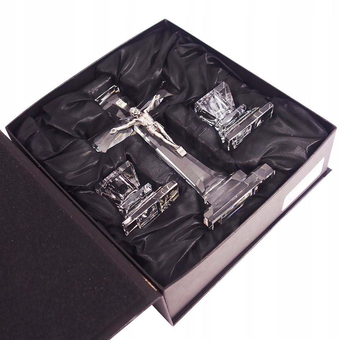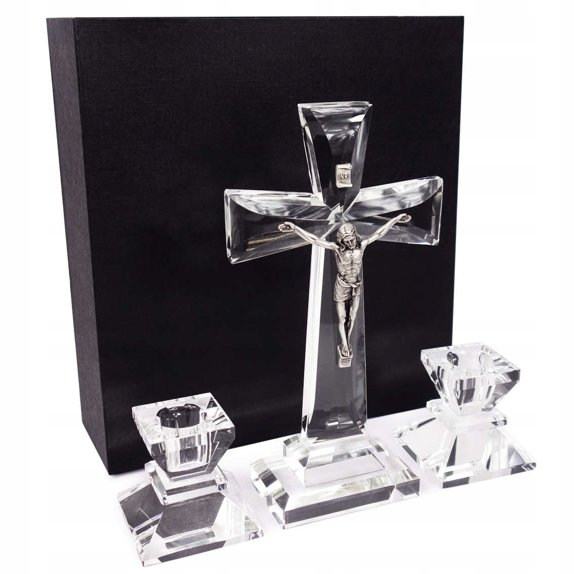 Набір містить два відповідні кришталеві свічники, які створюють узгоджене та естетичне ціле з хрестом. Весь набір упакований в елегантну чорну коробку, що робить його ідеальним подарунком - напр. з нагоди колядки, весілля, ювілею, Першого Святого Причастя або як обладнання домашнього молитовного кутка.