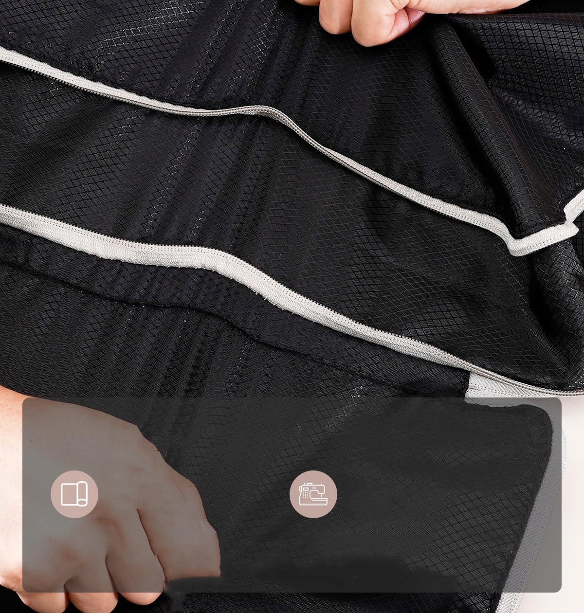 -Дихаючий нейлоновий матеріал зберігає ваш одяг або ковдру без запаху. М'який нейлоновий матеріал запобігає зминанню одягу. Крім того, матеріал міцний і не легко рветься. Нарешті, ця нейлонова тканина є водонепроникною, тож вам не доведеться хвилюватися про те, що ваш одяг намокне в сумці.
