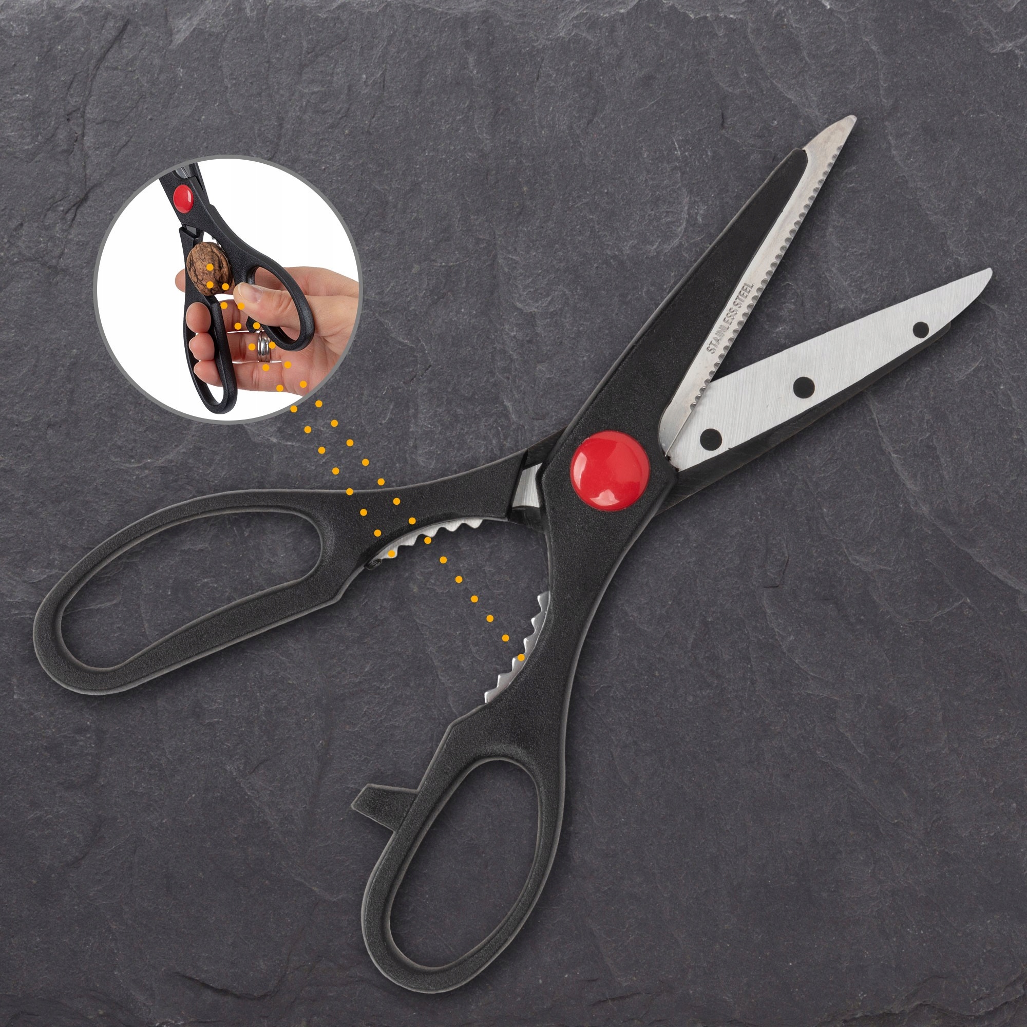 Точище довжиною 31 см є необхідним інструментом для зберігання ножі гострі. , а універсальні ножиці полегшать різання паперу, алюмінієвої фольги та інших кухонних виробів.