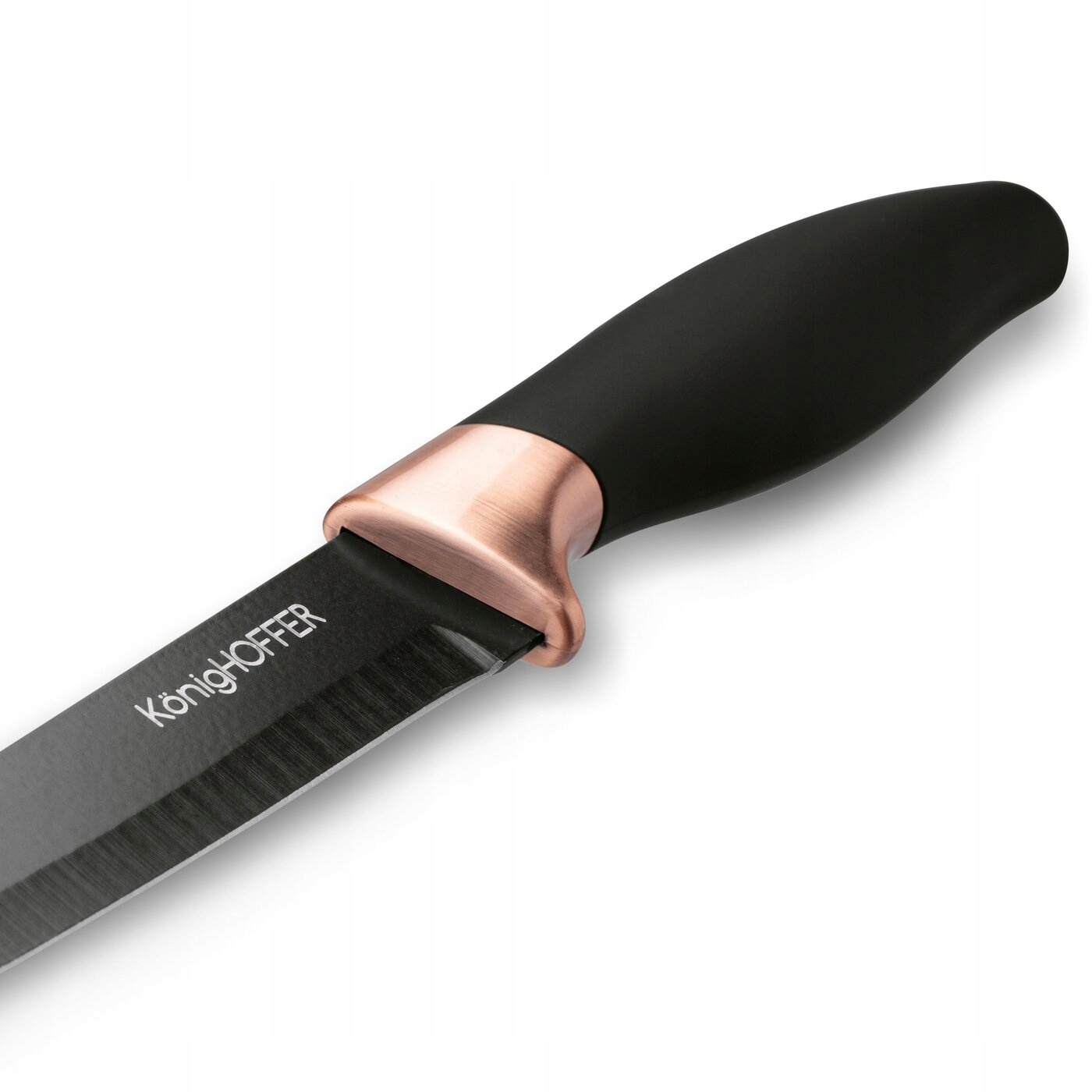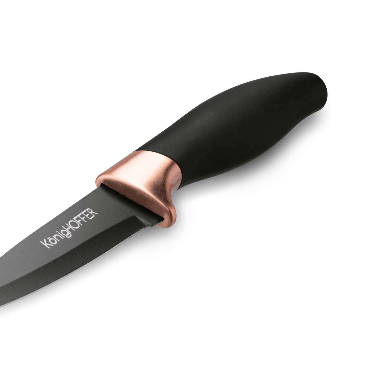 Набір з 3 кухонних ножів Konighoffer Dark підходить для щоденного використання в кожному домі. З універсальним ножем можна швидко впоратися, наприклад, з приготуванням бутербродів і помідорів, які потрібно нарізати тонкими скибочками. Ножем для овочів і фруктів варто скористатися, коли потрібно якісно очистити або розділити яблуко на частини. Також без проблем наріже інгредієнти салату. Завдяки цьому ніжні і м'які інгредієнти не будуть подрібнюватися. Найбільший (шеф-кухарський) ніж підходить для печені, нарізки, випічки та риби. Використовується також для рубання. Леза з високоякісної нержавіючої сталі міцні та надійні. Вони довго залишатимуться гострими та забезпечать точність у роботі. Вони покриті антипригарним покриттям, яке запобігає прилипання їжі. Ручки мають профільовану форму і оброблені поверхнею soft touch. Це означає, що вони не ковзають навіть у мокрих руках. Поєднання матового чорного та елементів, що імітують рожеве золото, додає комплекту елегантності та сучасного стилю.