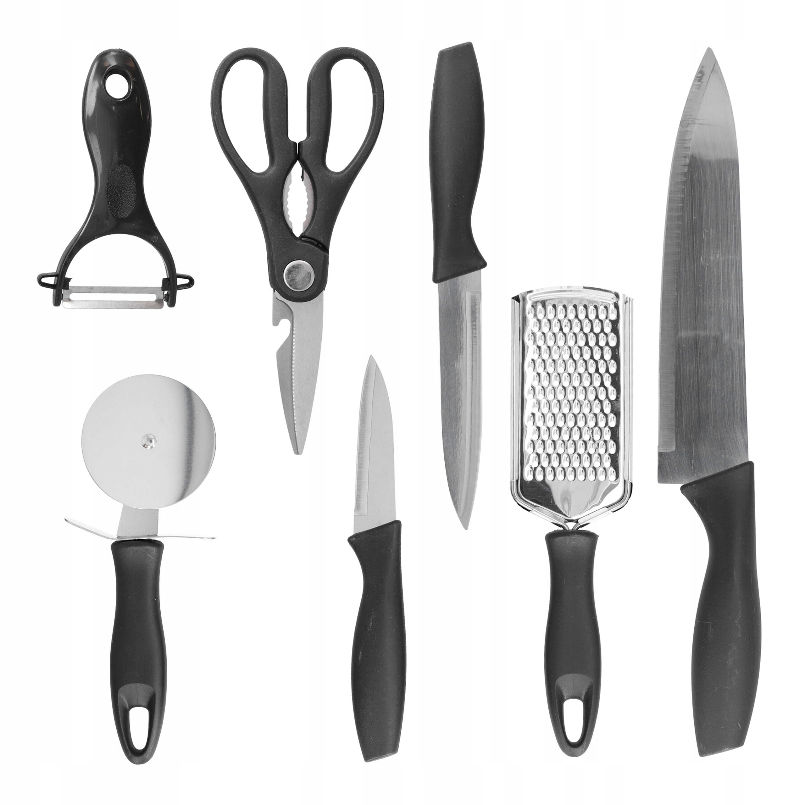 Повний набір кухонних ножів 7 в 1 - це практичне та універсальне рішення для будь-якої кухні. У набір входять не тільки ножі, а й терка, ножиці, очисник і різак для піци, що робить його надзвичайно функціональним. Ці інструменти, виготовлені з нержавіючої сталі 2CR14 і оброблені ручками з чорного ПП, поєднують міцність, легкість і зручність використання.