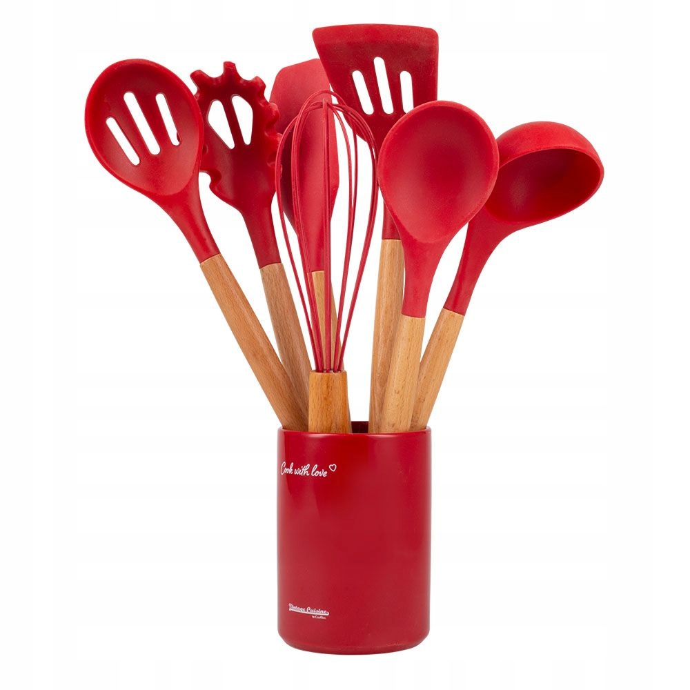 Ретро набір кухонного посуду - новинка в асортименті Vintage Cuisine! Відтепер ви не будете боятися будь-яких завдань на кухні, в набір входять всі 7 найкорисніших приладів, необхідних для приготування їжі, а саме: віночок, ложка для спагетті, ложка, ополоник, лопатка, ложка з дірочками і лопатка. Посуд виготовлений з натуральної деревини бука з силіконовими ручками.