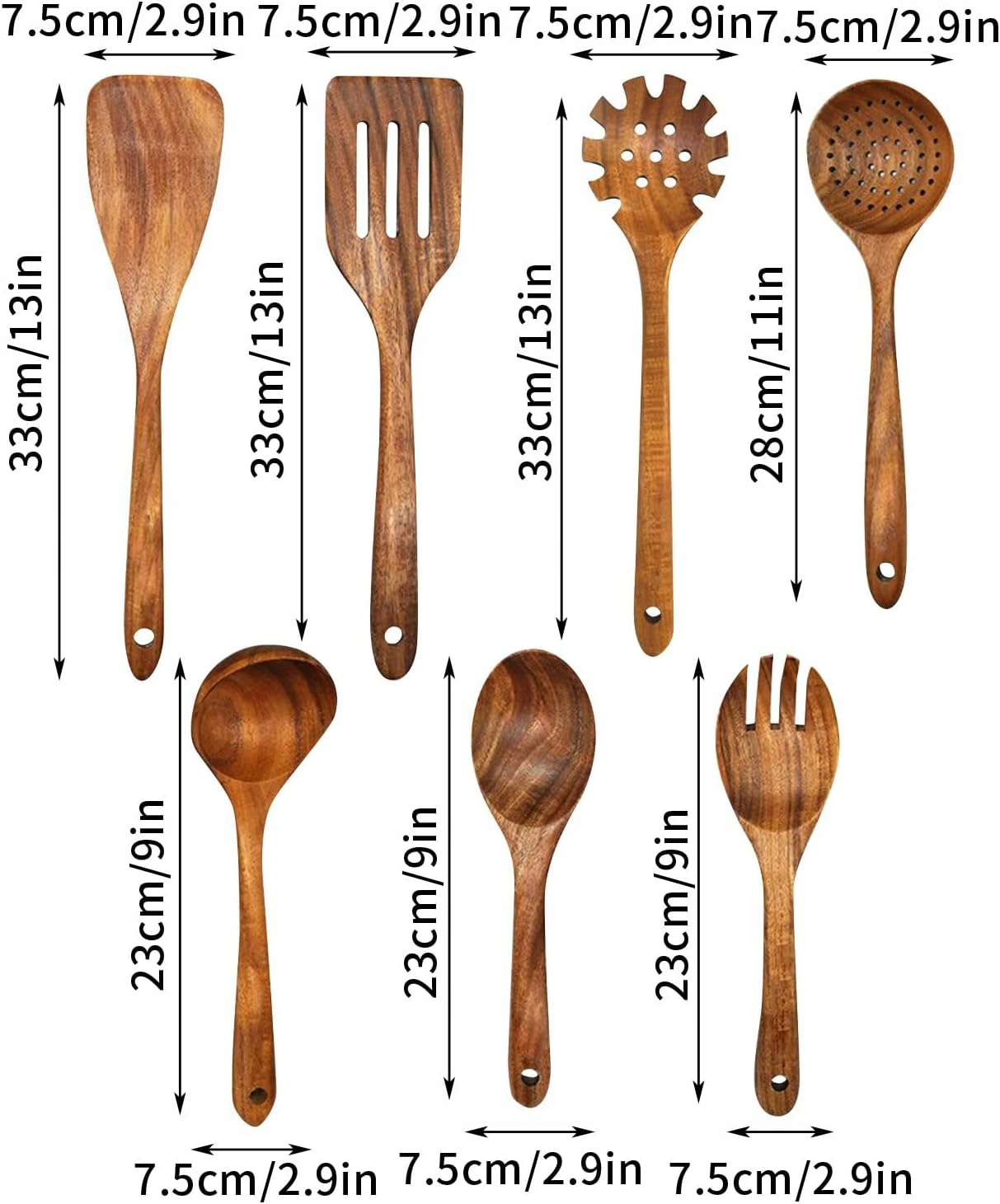 - ✅【Чудове виконання】: кожен набір дерев’яного посуду виготовлено з одного шматка тикового дерева без жодних з’єднань. Кухонний посуд багато разів полірували, що надає йому гладкої та делікатної поверхні та текстури дерева. Ні тирси, ні вм'ятин. Кухонне начиння є улюбленим серед шеф-кухарів і стане ідеальним подарунком для родини та друзів.