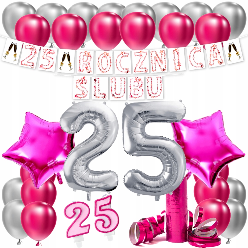 1x Великий банер/гірлянда: 25 РІЧНИЦЯ ВЕСІЛЛЯ + 3 ГРАФІКИ ОКАЛІВ - з вирізаними в кутах колами для переплетення стрічок - рожеві.