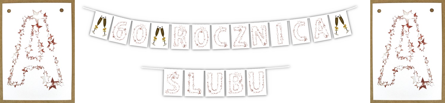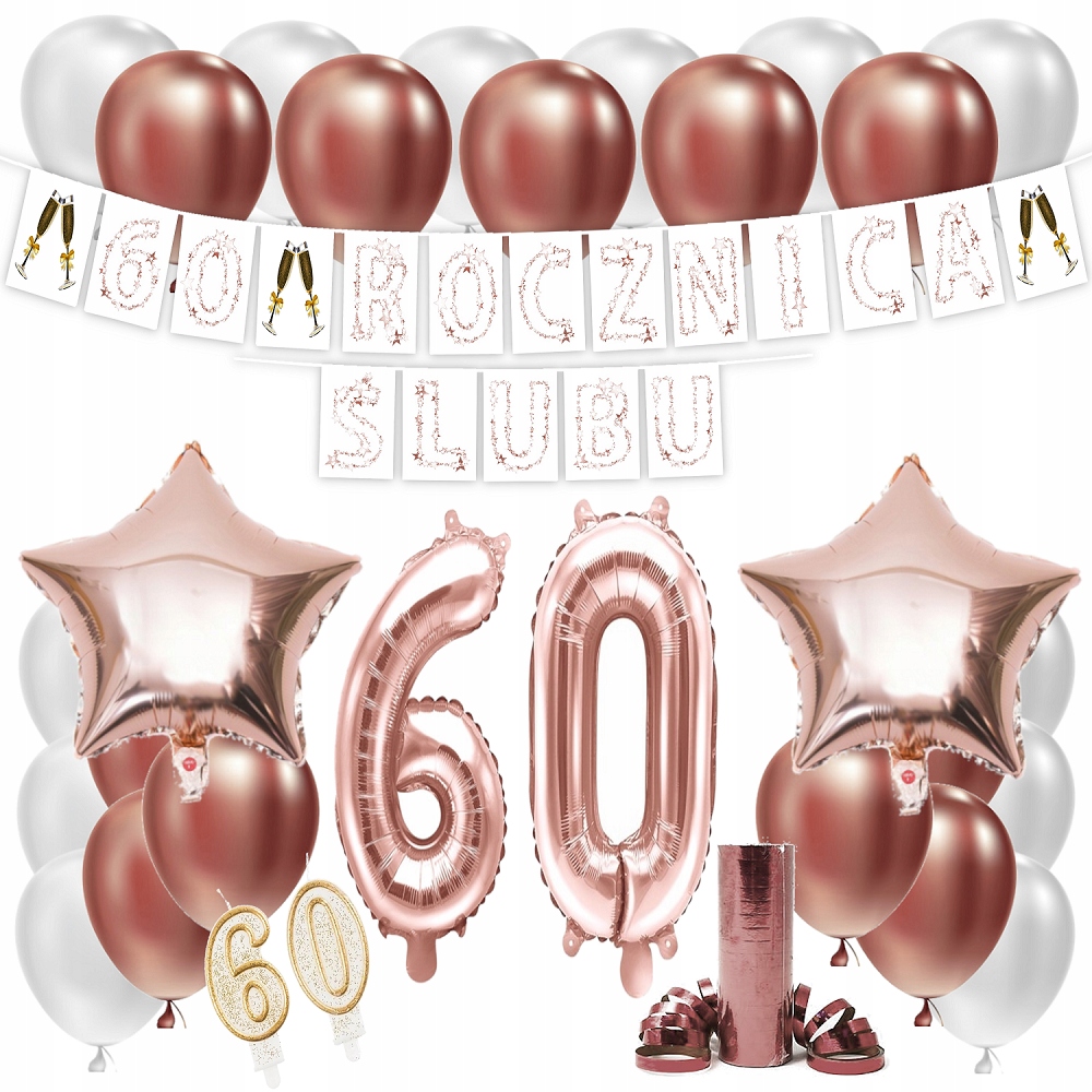 1x Великий банер/гірлянда: 60-ТА РІЧНИЦЯ ВЕСІЛЛЯ + 3 ГРАФІКИ ОКАЛІВ - з колами, вирізаними в кутах для переплетення стрічки - колір рожеве золото / рожеве золото, відтінок коричневого.
