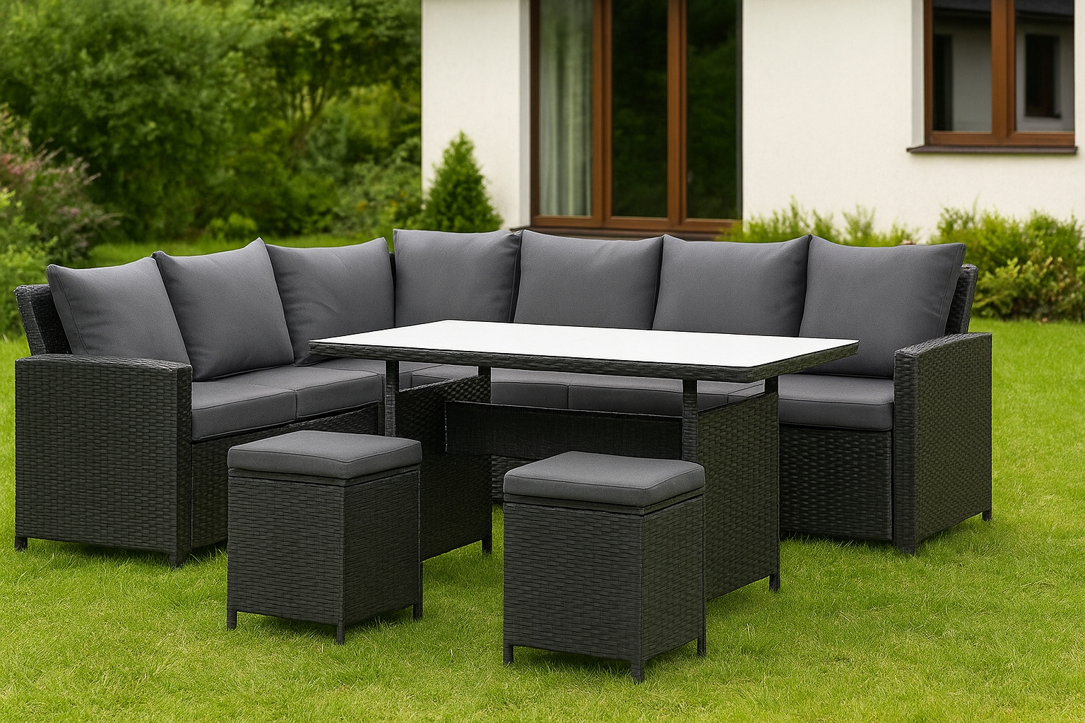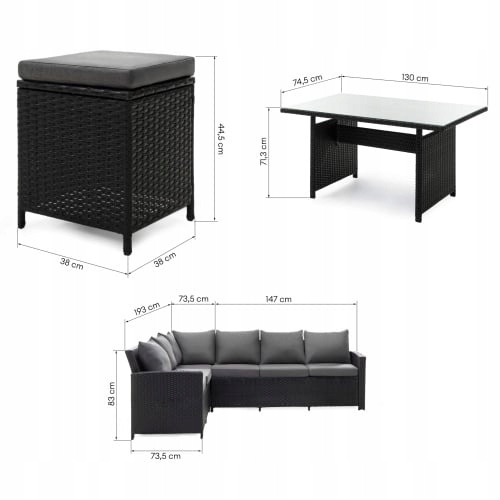 Модульний куточок - це стильний і функціональний предмет меблів, що складається з двох кутових диванів. Рама виготовлена з твердої та довговічної сталі, що забезпечує стабільність і жорсткість. Весь закінчений товстою технонораттановою косою в елегантному відтінку чорного , який гарантує довговічність та імунітет.