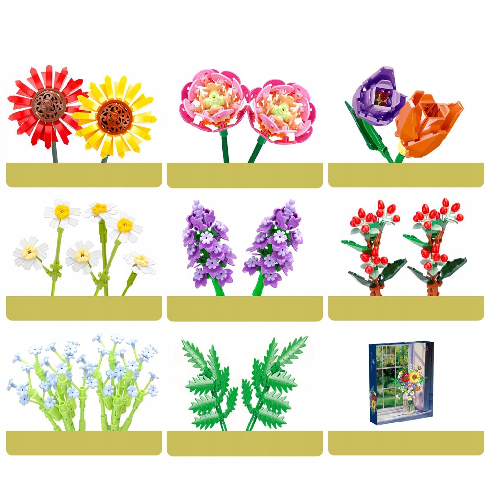 , що складається з 17 різних квітів, включаючи соняшники, тюльпани, лізиантус, ромашку, лаванду, гачки та гіпс. Букет квітів може побудувати діти з 14 років та дорослих, це захоплююча і красива імітація справжніх рослин та квітів.