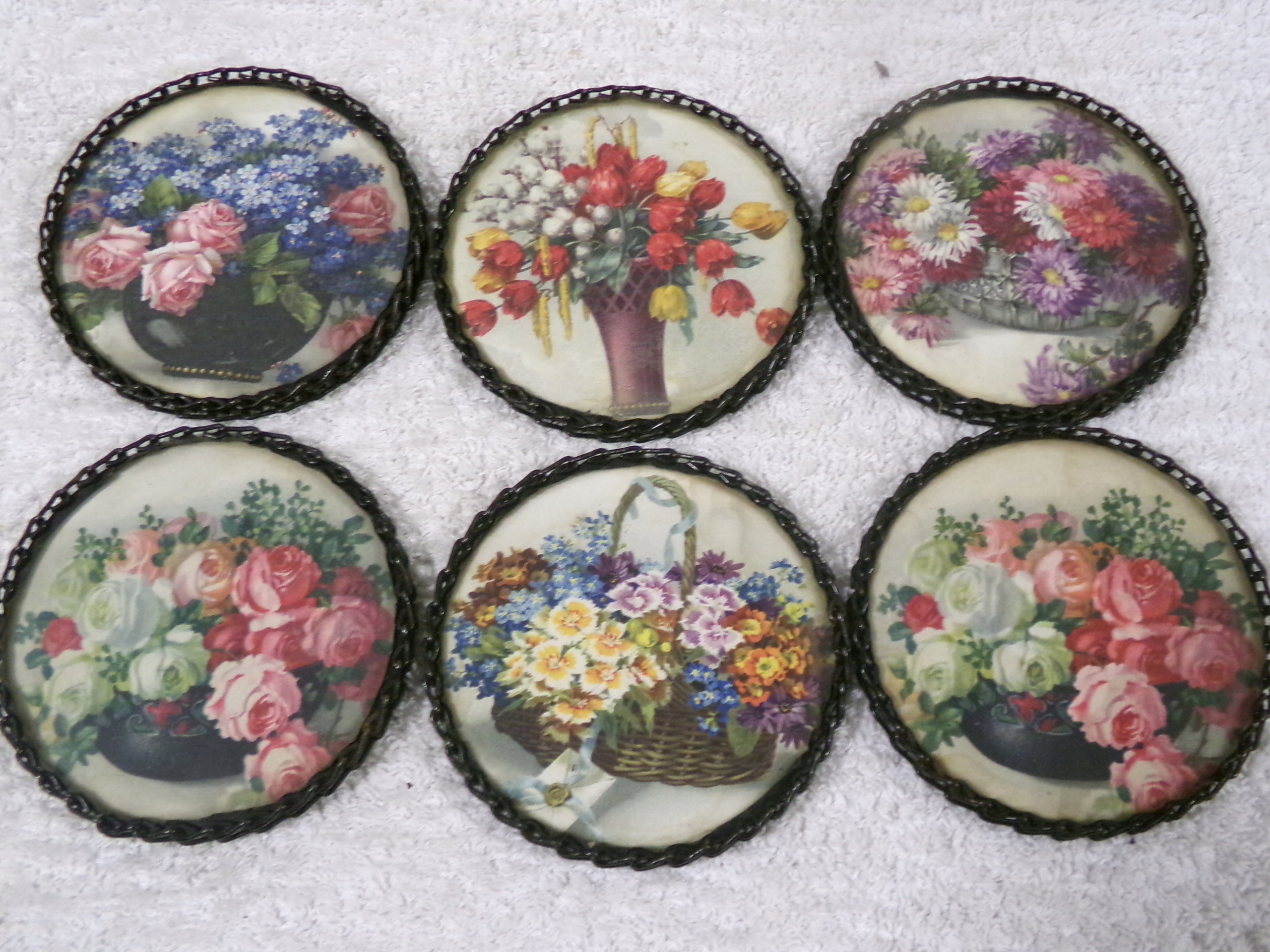 Набір металевих підстав із склом із зображенням квітів з діаметром 8,3 см, вагою 0,26 кг. Дуже хороший стан збережений, без пошкоджень.