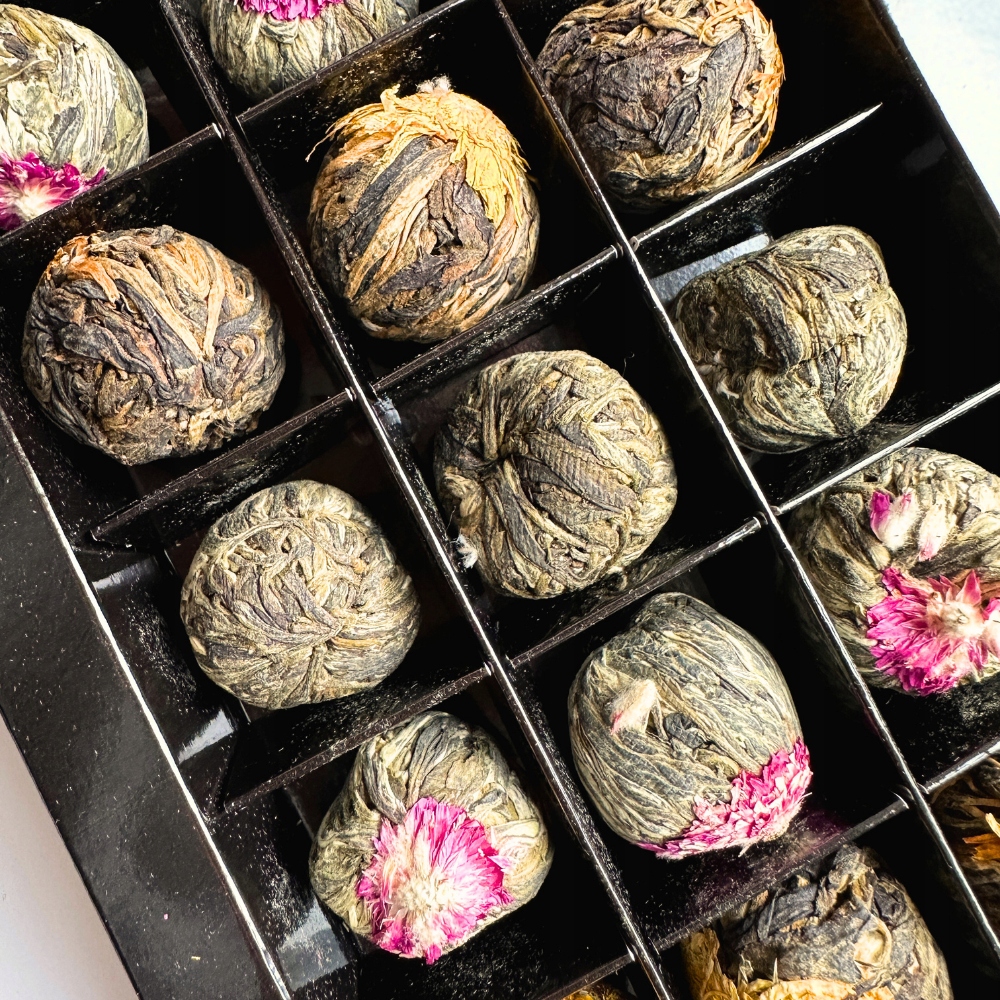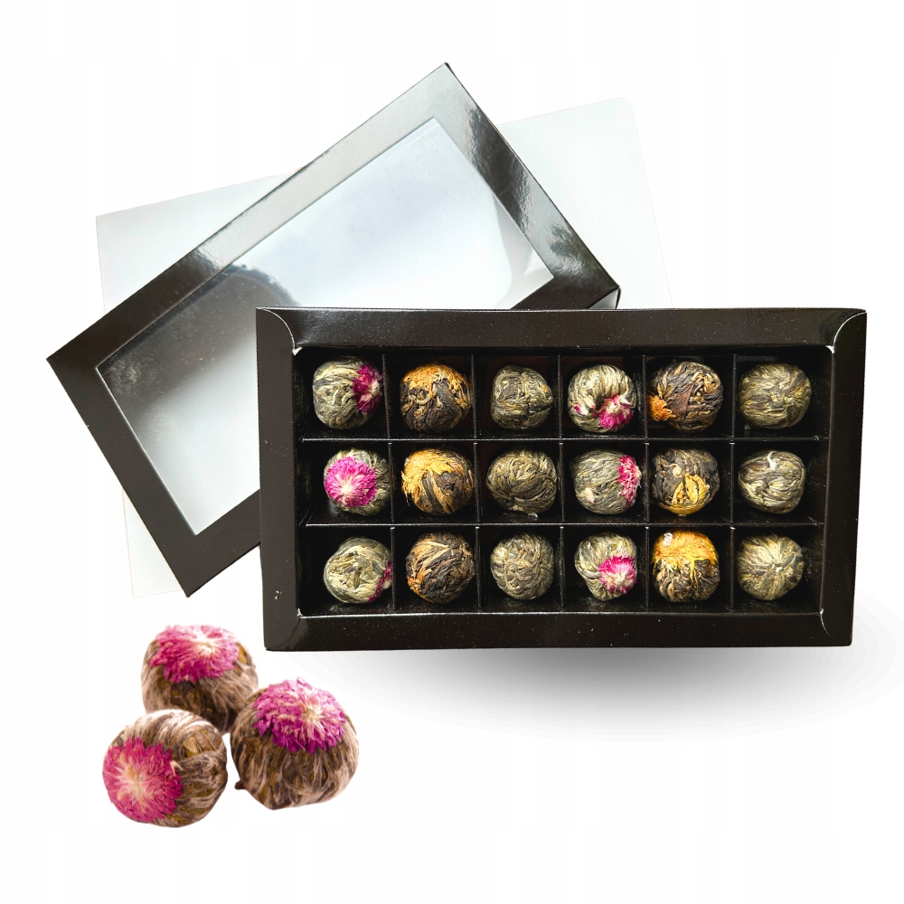 Набір квітучих кульок - це дивовижна подорож по всьому світу чайних відчуттів. Кожен з 18 чаїв -це ручний витвір мистецтва, приховуючи захоплюючий танець листя та квітів під час заварювання.