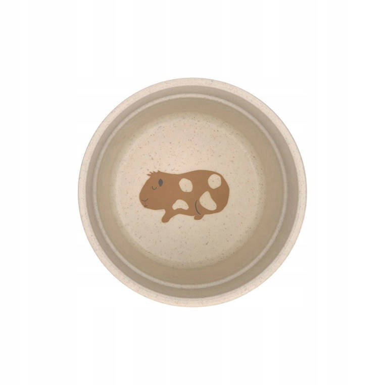 Усі елементи дуже світлого меланжево-бежевого кольору з барвистим візерунком, що імітує корм для домашніх тварин, і зображеннями цих істот на кожному з них. На тарілці зображена плямиста такса, на дні миски - кошеня з блакитними коржами, на дні чашки - морська свинка з коржами, а на ручці ложки - кролик з блакитним хвостиком.