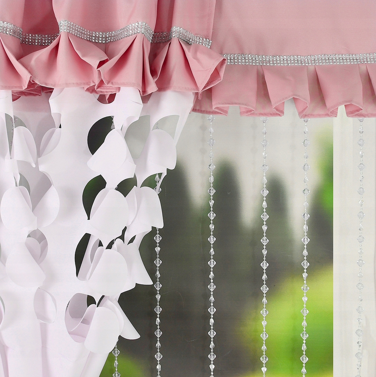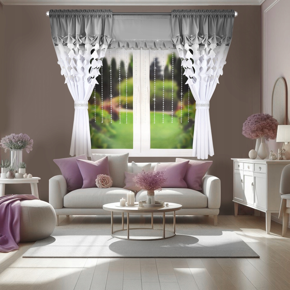 Додатковим декоративним елементом є підвісні намистини, які тонко мерехтять на світлі, додаючи ще більшої вишуканості та шарму. до набору. Саме ці дрібні деталі надають шторам неповторний характер, роблячи їх не лише функціональним елементом оформлення вікна, а й справжньою окрасою кімнати.