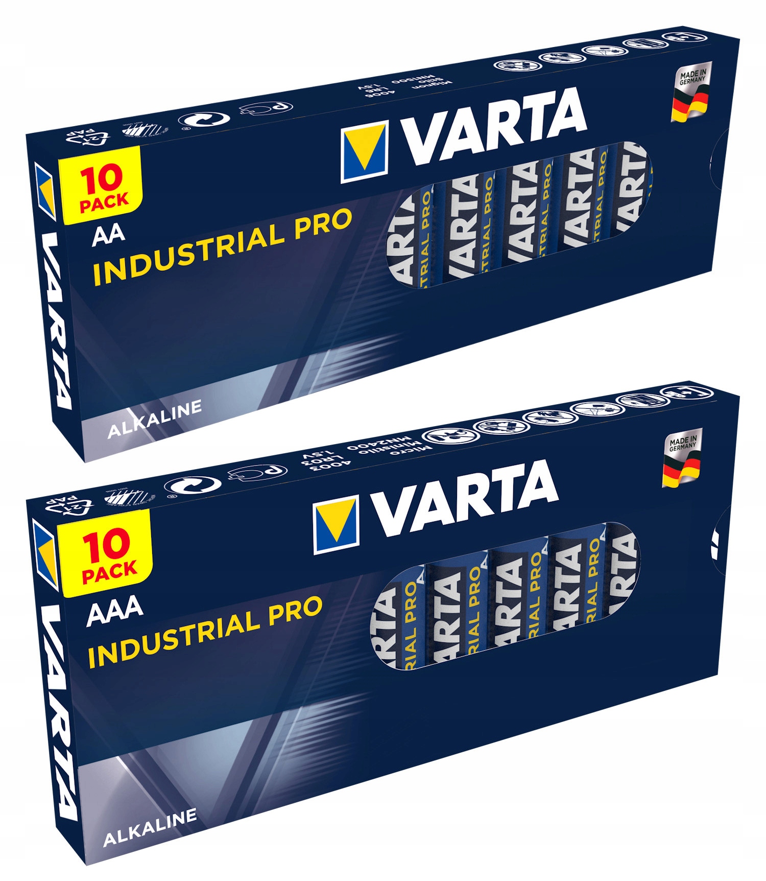 20 одиниць вдосконалених лужних батарей LR03 AAA та LR06 AA VARTA Industrial, призначених для професійного/промислового застосування. Одна з найпотужніших лужних батарей на ринку. Дуже довгий мінімальний термін придатності.