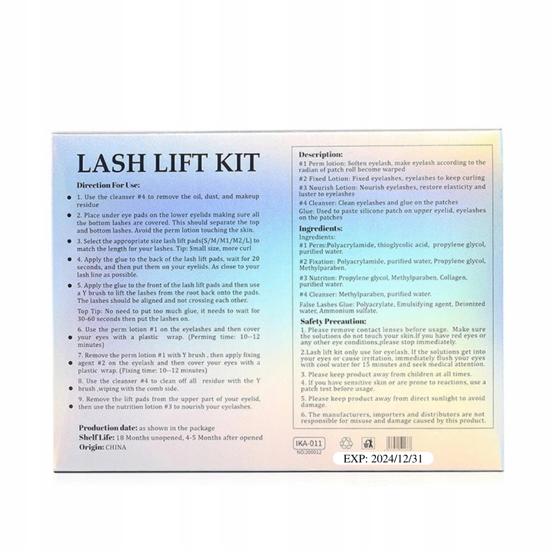 - Виробник, імпортер і дистриб'ютор не несуть відповідальності за неправильне використання продукту або пошкодження, спричинені цим продуктом. ЦЕЙ ПРОДУКТ ПРИЗНАЧЕНИЙ ЛИШЕ ДЛЯ ПРОФЕСІЙНОГО ВИКОРИСТАННЯ СЕРТИФІКОВАНИМИ СТИЛІСТАМИ НАРІШЕННЯ ВІЙ ІЗ ЧИННИМ СЕРТИФІКАТОМ У ГАЛУЗІ ЗНАНЬ ПРО ПІДВІДКУ/ЛАМІНУВАННЯ ВІЙ.