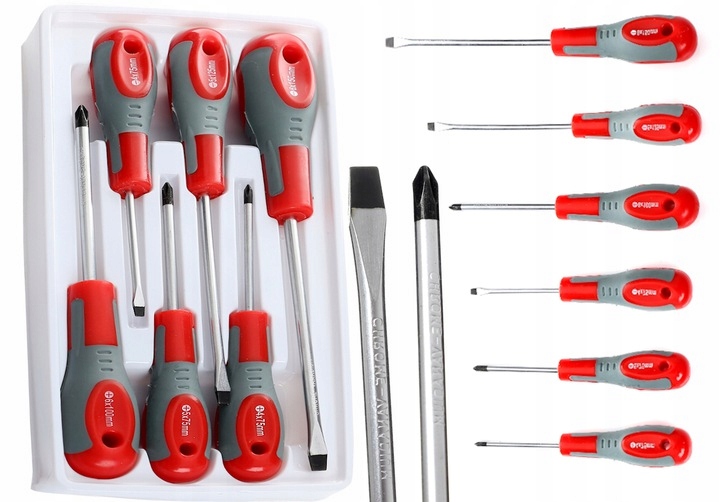 Набір викруток виготовлено з високоякісних матеріалів, включаючи хромованадієву сталь, наконечники мають атласне покриття для захисту від корозії, а наконечники наконечників додатково піддані піскоструминній обробці та намагнічені, що забезпечує надійний захват головки гвинта. Рукоятка виготовлена з пластику та покрита гумовим покриттям, що гарантує міцне захоплення в руці.