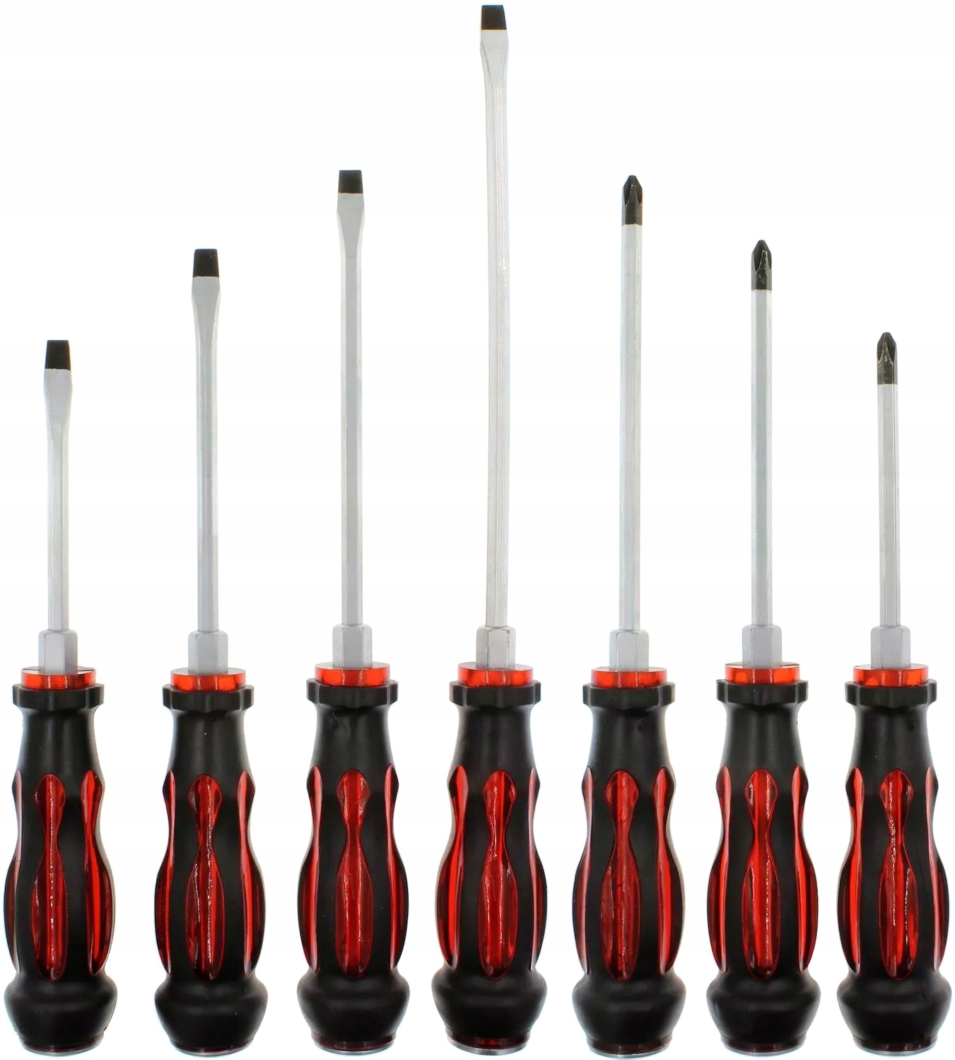 Наш набір міцних перфораційних викруток включає 4 плоскі викрутки та 3 хрестоподібні викрутки PH1 довжиною від 21,5 до 31,5 см. Робоча частина пропонованих викруток виготовлена з хромованадієвої сталі (CR-V), а ергономічна рукоятка, що забезпечує зручність роботи, виготовлена з пластику.