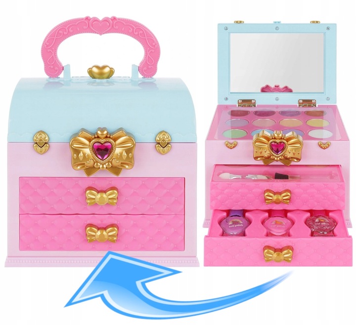 Чехол, що закривається, відрізняється багатим оснащенням. У набір входять маріонетки, кисті, тіні, пудра і вбудоване велике дзеркало. Крім того, 2 шухляди, що замикаються, полегшують зберігання косметики в ідеальному порядку.