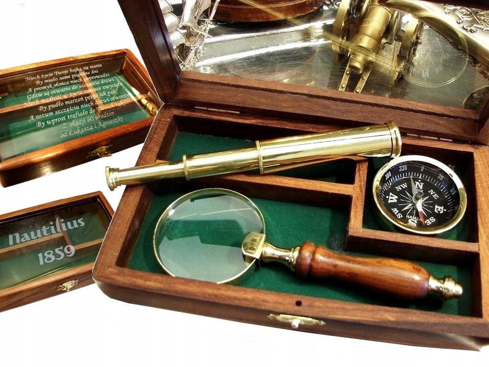 Запрошую придбати гарний дорожній чи матроський набір. матеріал - латунь, дерево і скло, коробка зі скляною кришкою, телескоп, компас і збільшувальне скло.Колір дерев'яної ручки може відрізнятися від зображень. Він може бути світлішим або темнішим. На склі можна зробити присвяту як в наведених прикладах.