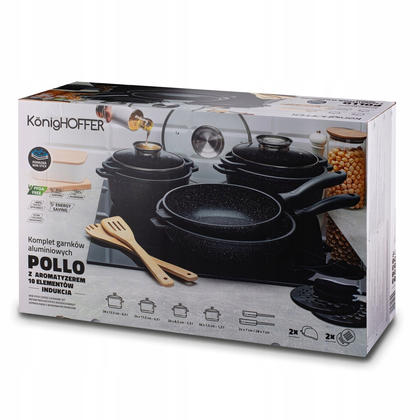 Набір мармурових каструль Konighoffer Pollo із 10 предметів включає 2 тканинні кришки для ручок і 2 подушечки для гарячих каструль. У сковородах використовуються м'які ручки, які не ковзають в руках і не поглинають тепло. Набір дозволяє безпечно готувати і смажити без ризику обпекти руки. У набір входять посудини об'ємом від 1,2 до 6,5 л. Каструлі мають діаметр 24 і 28 см. Каструлі оснащені скляними кришками зі сталевим бортиком для захисту від сколів. Вони також мають стильні ручки з нержавіючої сталі. Це так звані ароматизатори, які дозволяють легко додавати воду, вино чи олію, не піднімаючи кришки. З набором кам’яних каструль Pollo ви можете готувати на будь-якій плиті. Гранітне антипригарне покриття та обробка алюмінієвих корпусів у стилі чорного мармуру додають йому елегантності. Вони швидко нагріваються, тому ви заощадите час і енергію. Ідеально підійдуть для сімейної кухні або на подарунок. Вони також добре захищені від високих температур і рівномірно проводять тепло. Невід'ємною частиною корпусу посудини є литі ручки. Оскільки вони не мають додаткових з'єднань, вони нагріваються разом з каструлями. У зв’язку з цим необхідно використовувати захисні чохли (тканинні, силіконові) або духові рукавички під час перенесення виробу на плиту та з неї, а також виймання з духовки, щоб не обпекти руки. Роль доданих накладних матеріалів полягає в тому, щоб оптимально захистити руки користувача від опіків. У випадку представленої посудини вони є елементом, необхідним для того, щоб зняти горщики з плити, перенести їх або вийняти модель з печі. Окрім міцного захоплення, вони ізолюють тепло від шкіри. Природно, що частина тепла буде відчуватися. Однак його рівень підтримуватиметься на безпечному рівні.