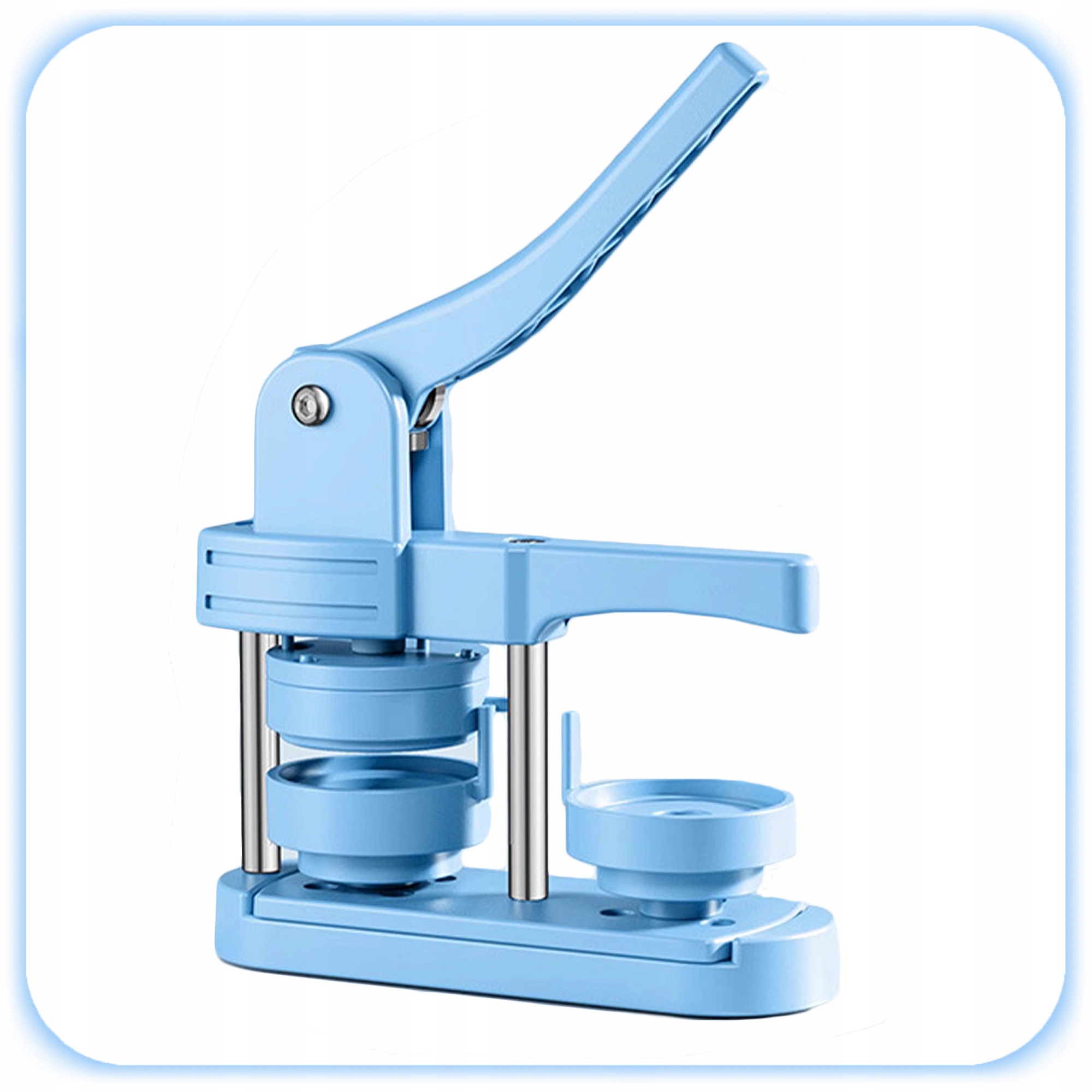 Синій 58-мм верстат для виготовлення значків — це повний стартовий набір, який дозволяє створювати власні шпильки, значки, магніти та сувеніри вдома, у школі чи в майстерні DIY.