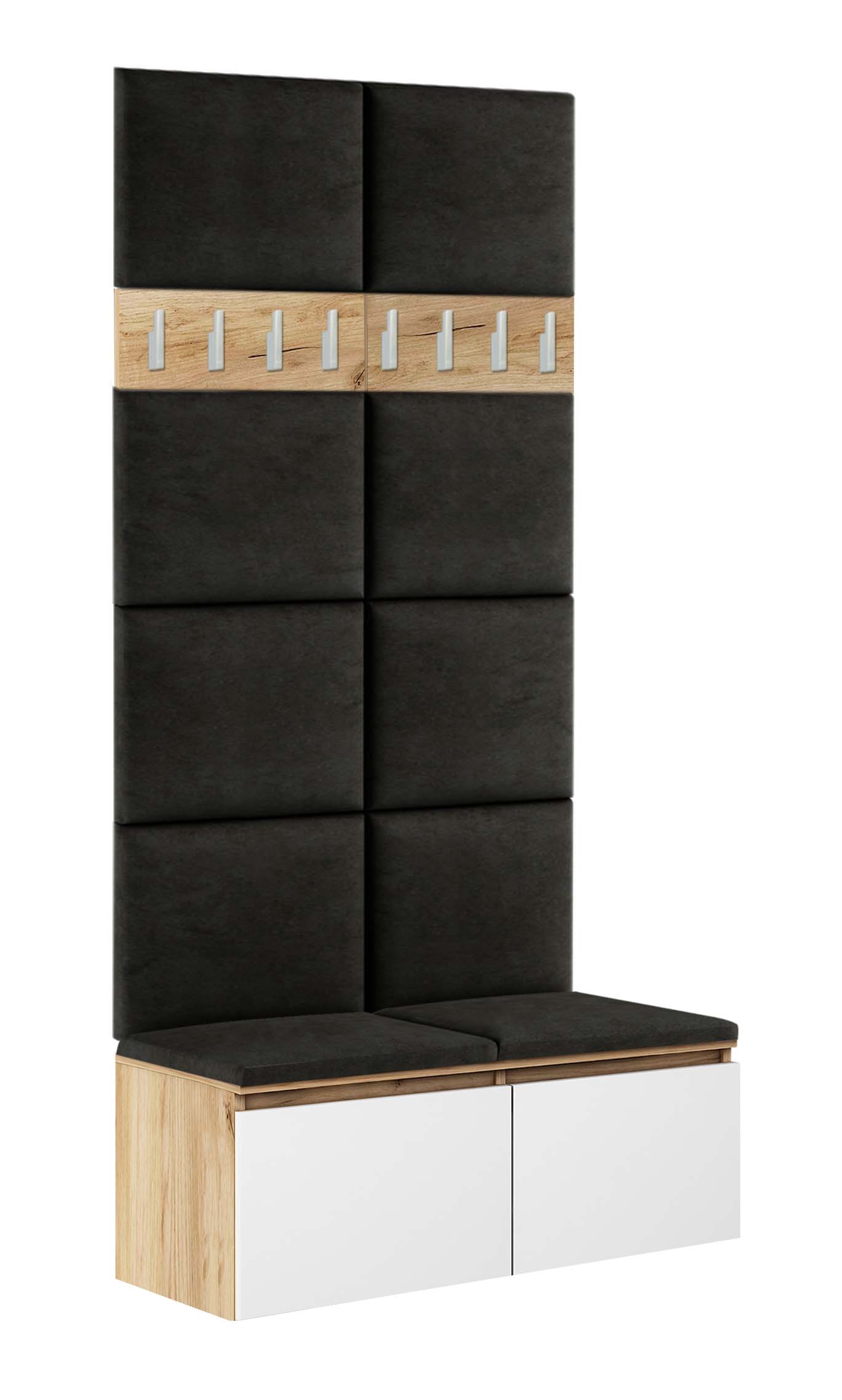 Модульні м'які панелі зроблять ваш інтер’єр надзвичайно затишним. Ви можете встановити їх, наприклад, у залі, створивши приємний куточок у вашому домі. Панелі, які ми пропонуємо, мають розмір 50х37x5 см і мають той самий розмір і колір, що використовуються в шафі взуття Megan 1. Загальна товщина панелі - 5 см.